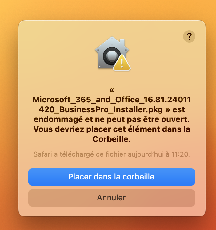 Après avoir téléchargé le fichier .pkg, un message apparait indiquant que le fichier est endommagé, ce qui n'est pas le cas a priori.