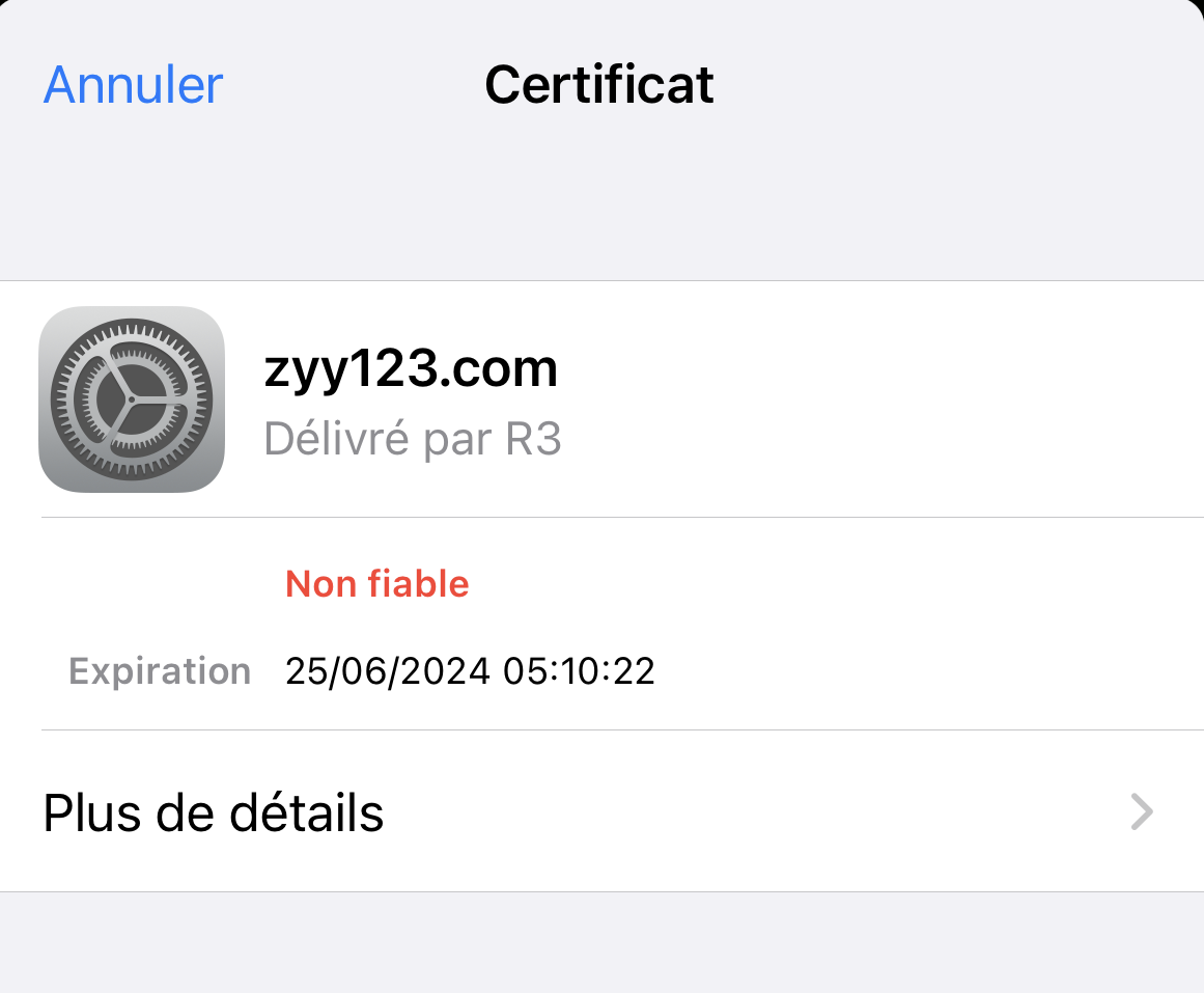Il est dit sur ce message popup : "Vérification de l'identité du serveur impossible, l'identité de "dynical.com" ne peut être vérifié. Quand je clique sur "détail", il apparaît ce message concernant le certificat : " zyy123.com non fiable expiration 25/06/2024 05:10:22", en allant sur "plus de détail", l'organisation est indiqué : "Let's encrypt", "nom commun : R3".