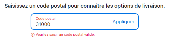 Lors de la commande d'un mac sur le site je reste bloqué au moment du choix de livraison car le site refuse d'accepter le code postal de la ville de Toulouse... Je vois que le problème est récurrent sur le forum, je vais vraiment devoir aller chez un revendeur pour cet achat ? Premier achat de mon coté chez mac et je suis dubitatif devant ce problème, si j'ai un soucis quand je vais vouloir accéder au sav ça aussi me bloquer mon code postal et engendrer des soucis inutile ?! Merci d'avance