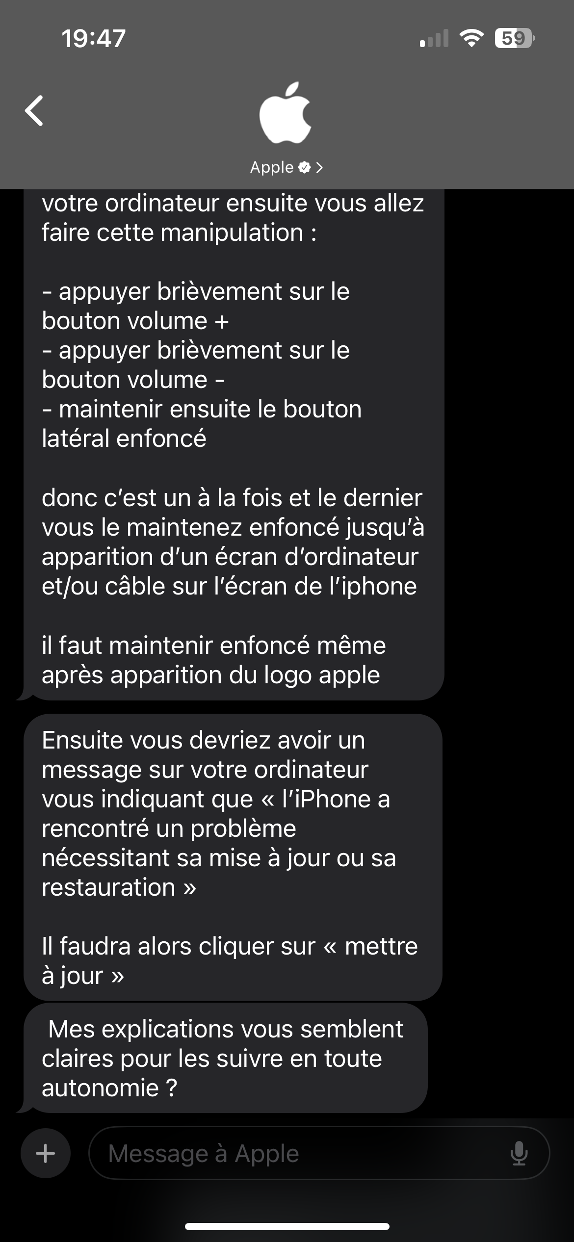 Mon opérateur de tél et le centres de réparation ont tous mis la faute sur apple "qui ne reconnait pas son bug dans la dernière mise à jour" ...