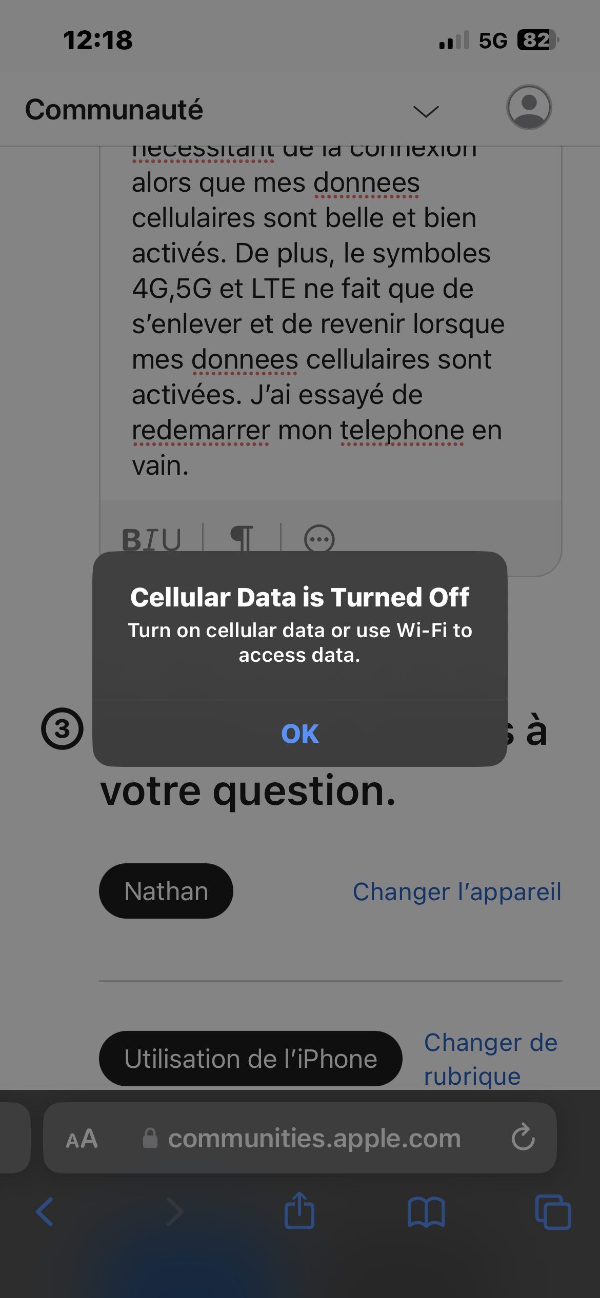 bonjour, je rencontre des problemes avec mes données cellulaires, en effet j’ai installé la nouvelle mise a jour hier, la 17.4.1, et depuis mes données cellulaires sont inefficaces. Lorsque j’active mes données cellulaires et que je lance une application, le message « cellular data is closed off » s’affiche alors que celles-ci sont belles et bien activées. De plus, les symboles 4G/5G/LTE ne font que de disparaître et réapparaître lorsque mes données cellulaires sont activées. En espérant avoir des reponses me permettant de resoudre ce problème.