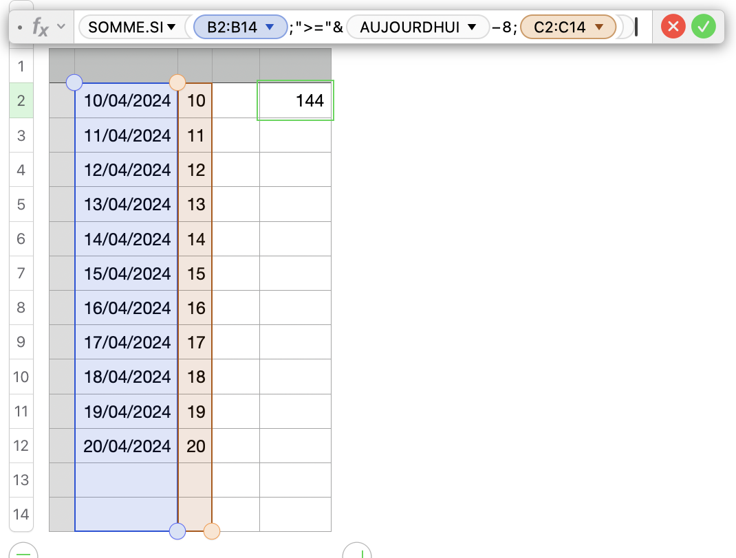 Je cherche à faire un SOMME.SI sur le nombre de KM pour les dates qui sont à moins de 8 jours de AUJOURDHUI().