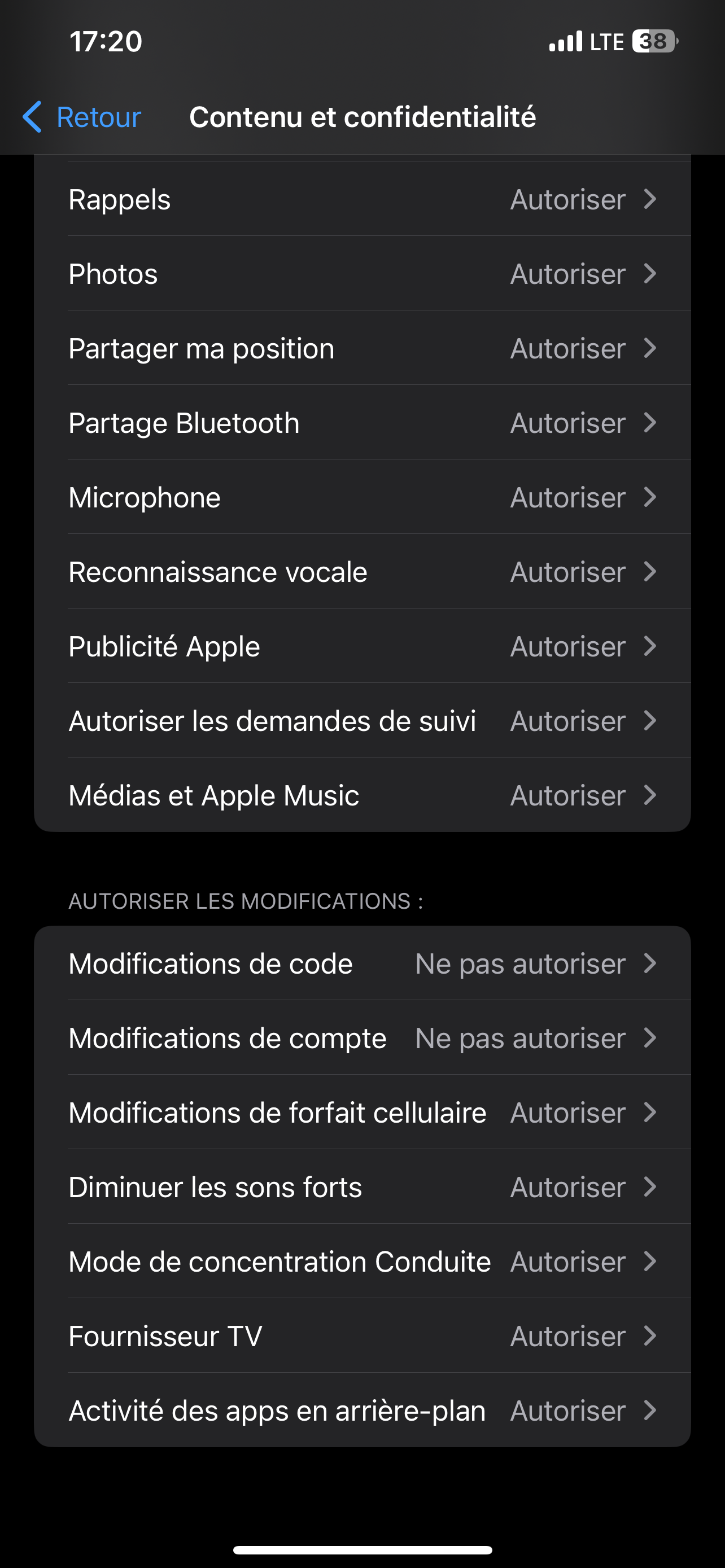 Reglages, Temps d’écran, contenus et confidentialité, activer restrictions, modification du code et modification du compte.