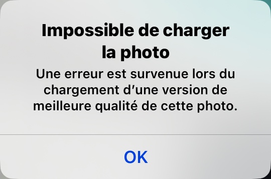 Ce message d’erreur s’affiche sur certaines photo de ma bibliothèque alors que j’ai bien vérifier dans mes réglages et j’ai l’option « optimiser les photos » désactivée.