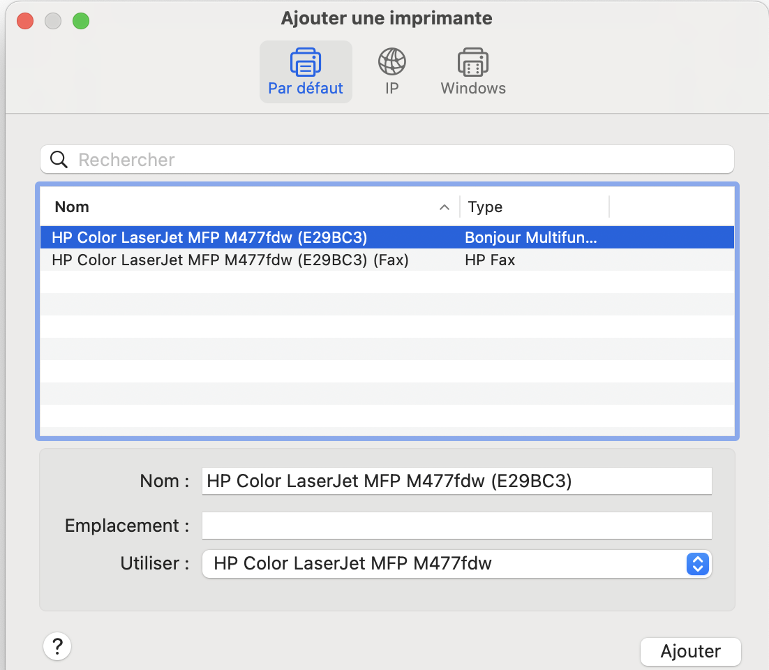 Quand je veux "ajouter une imprimante", mon mac me propose en même temps le fax et l'imprimante alors qu'il s'agit du même produit (voir IE jointe).
