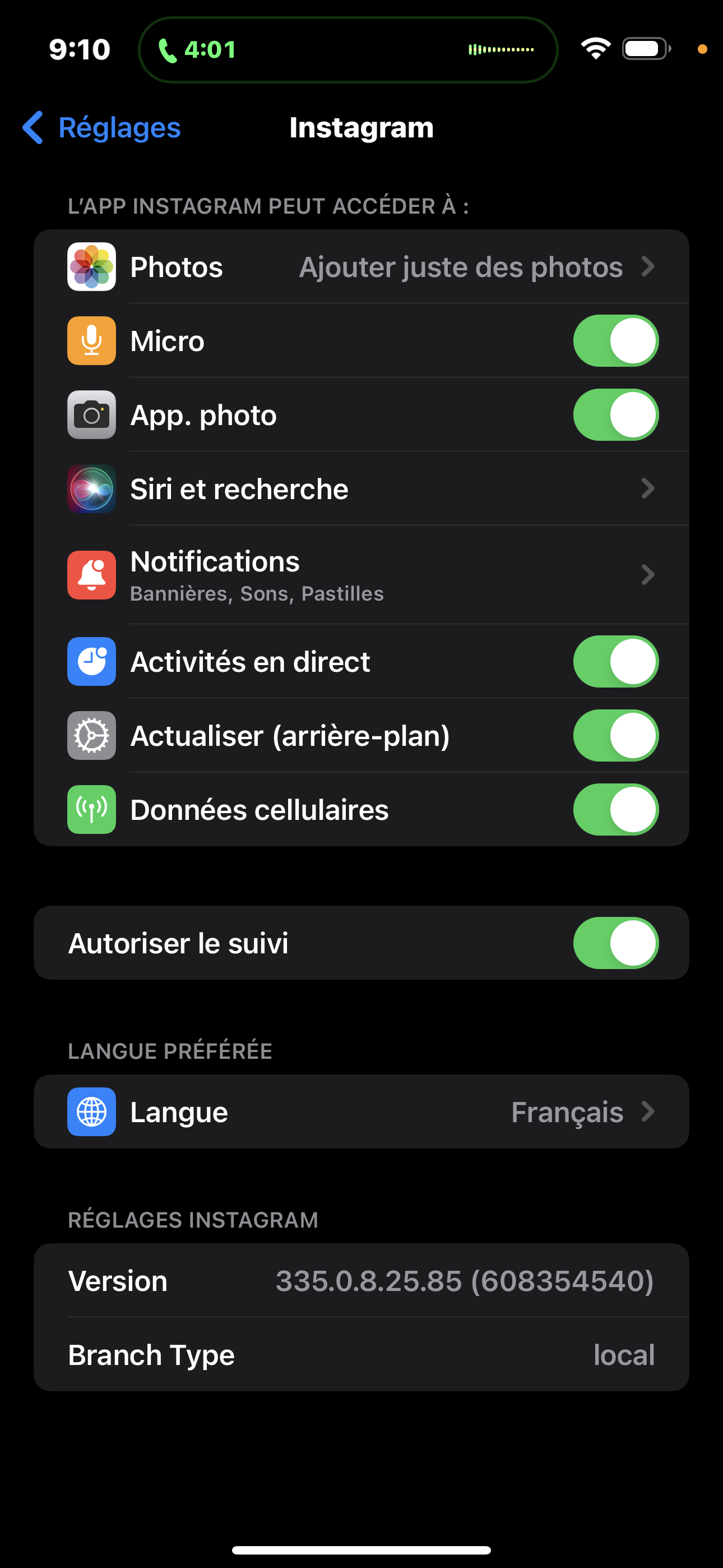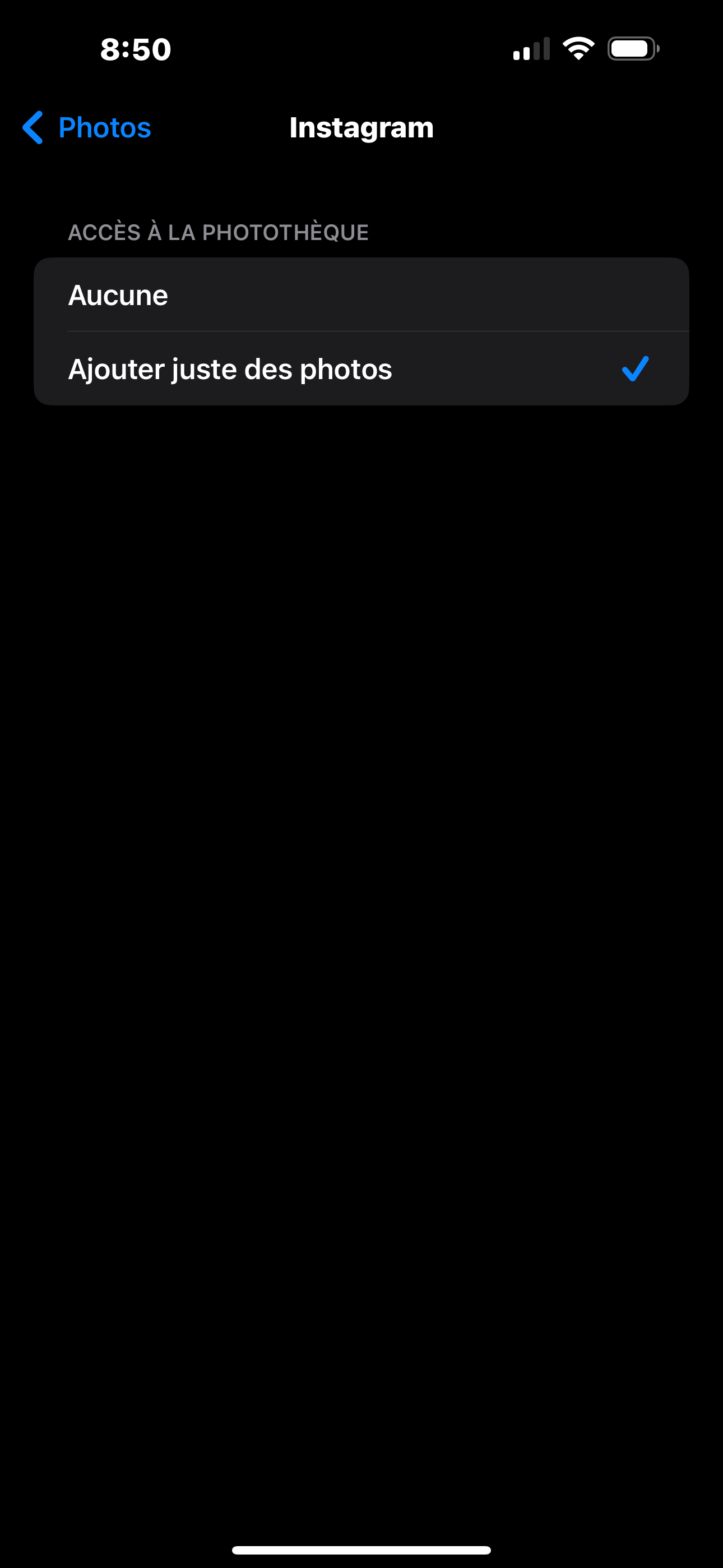 La réinstaller permettrait d'avoir le pop-up d'Apple demandant si vous voulez que Instagram accède à toutes vos photos ou que à certaines photos voir aucune.