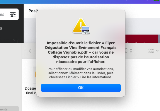 Je rencontre un problème depuis une semaine, lorsque je télécharge des fichiers depuis le web ou autre sur mon Mac, l'ouverture du dit fichier m'est refusé car je n'ai pas l'autorisation pour l'ouvrir. J'ai un MacBook Air de 2015 qui fonctionne sous MacOS Monterey.