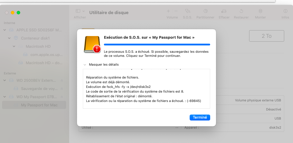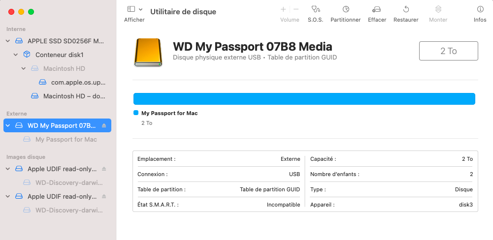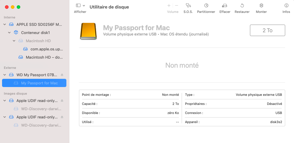 Dans la 2e capture d’écran (avec “My Passport for Mac” sélectionné), cliquez “S.O.S.” pour vérifier et réparer la partition. Si ensuite la partition ne se monte pas automatiquement, cliquez à nouveau sur “Monter”.
