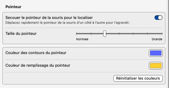 Il faut que je rallume le Mac après avoir débranché l'écran parallèle pour revoir le pointeur. Voici le réglage dans "Accessibilité :