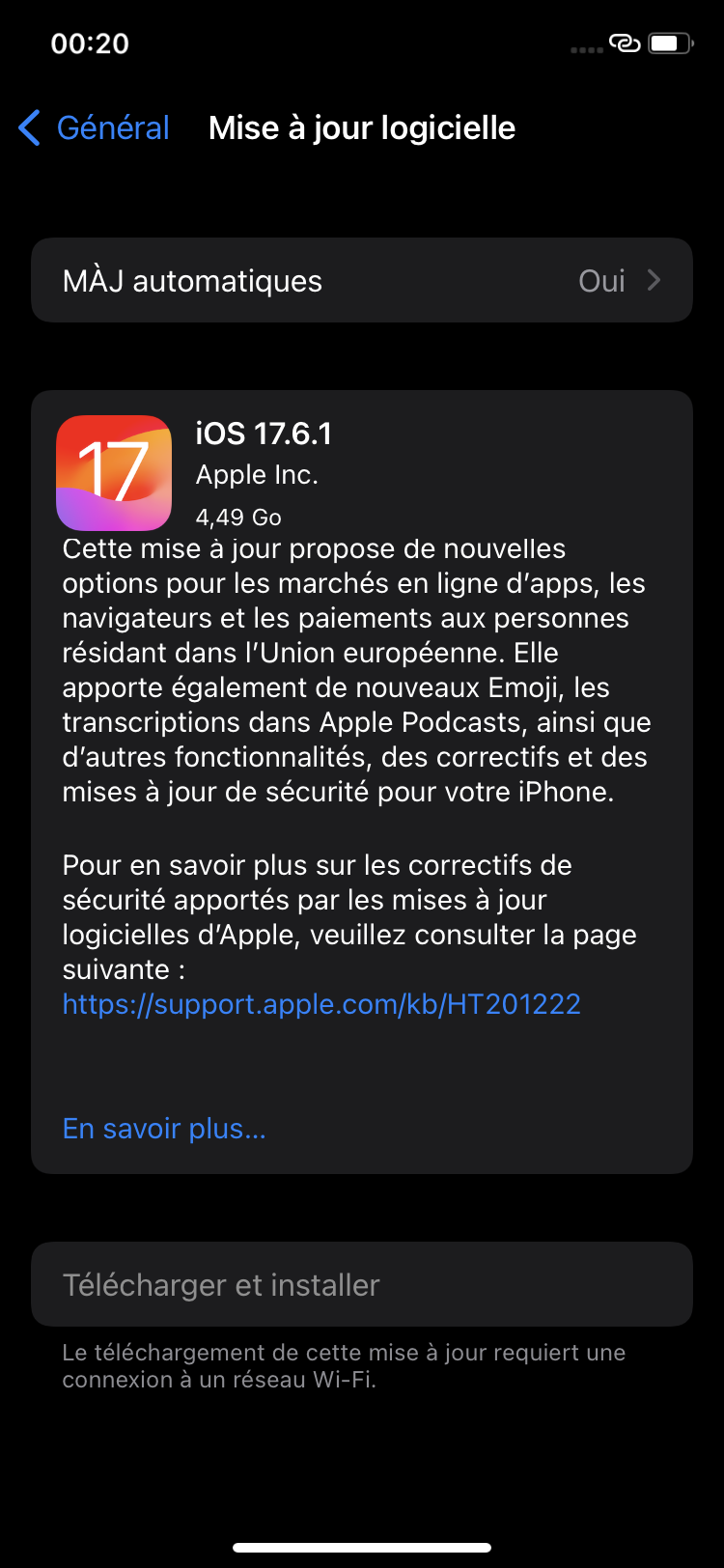 Je n’arrive pas à l’installer la mise à jour sur le télécharger et installer cela est désactivé dans mon iphone, j’utilise l’iPhone XR et la version 15.6.1 et veux télécharger iOS17.6.1 mais ça ne marche pas.