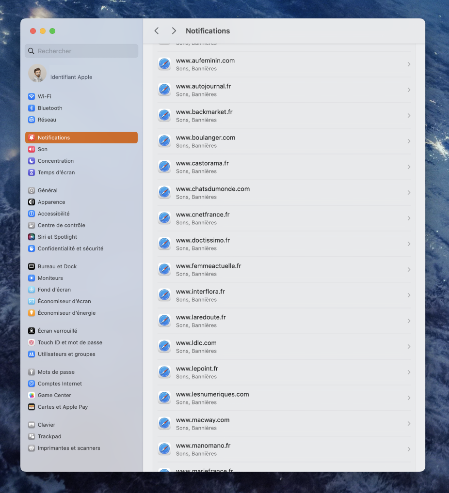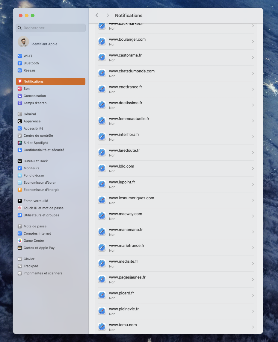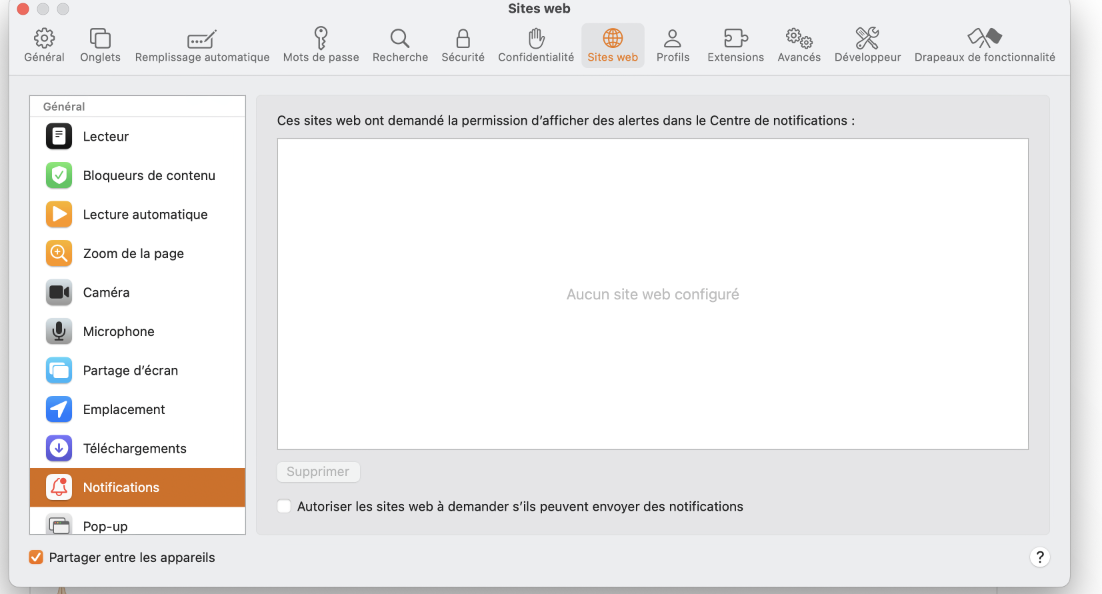 Il est possible de supprimer ces notifications dans les réglages de Safari mais je crois comprendre que certains utilisateurs voient toujours la liste (que vous affichez dans Réglages Système) après l’avoir fait.
