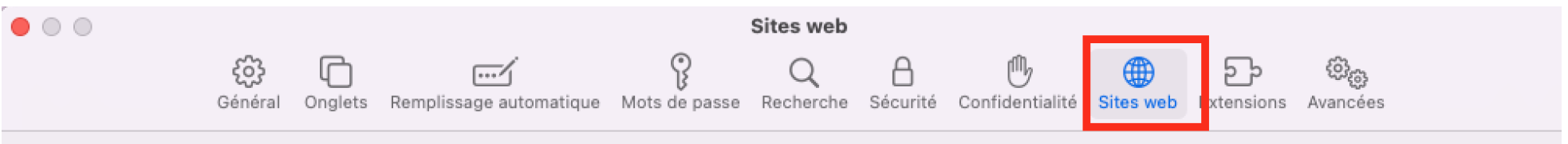 Ouvrez Safari, cliquez Safari > Réglages dans la barre des menus, cliquez l’onglet Sites web puis cliquez Notifications dans la barre latérale. Dans la liste à droite, supprimez les sites qui vous envoient des notifications (je n'en ai aucun dans ma liste ci-dessous) :