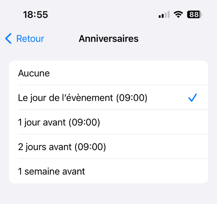 Menu --)Réglages--)Calendrier--)Alertes par défaut--)Anniversaires: