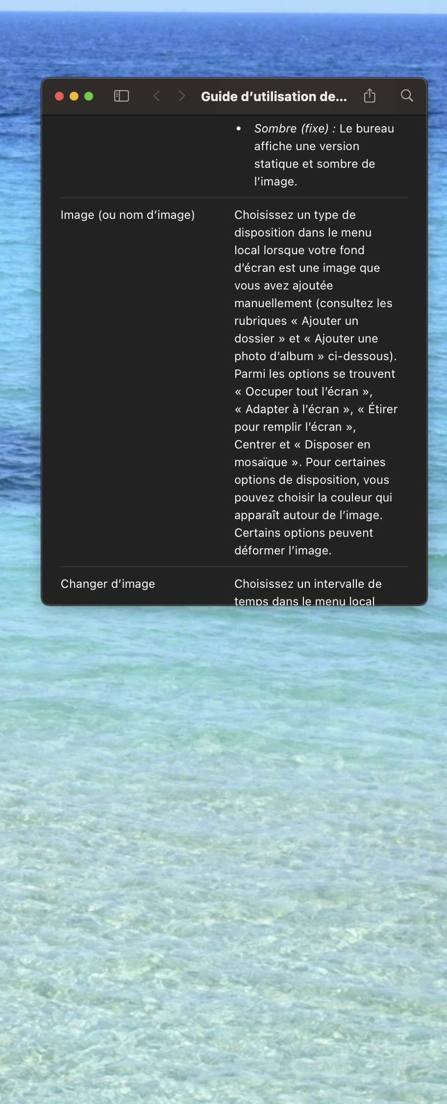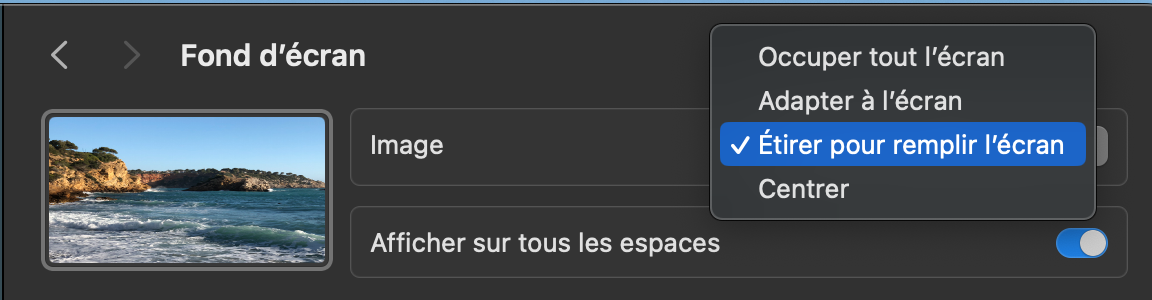 J'essaye depuis plusieurs jours d'adapter les photos du fonds d'écran à la taille réelle et non en plein écran (qui coupe les photos) Cela fonctionnait très bien avant(!) mais depuis le changement du fonds d'écran il s'affiche "plein écran" et coupe les photos (car très grossies pour s'adapter au format écran)