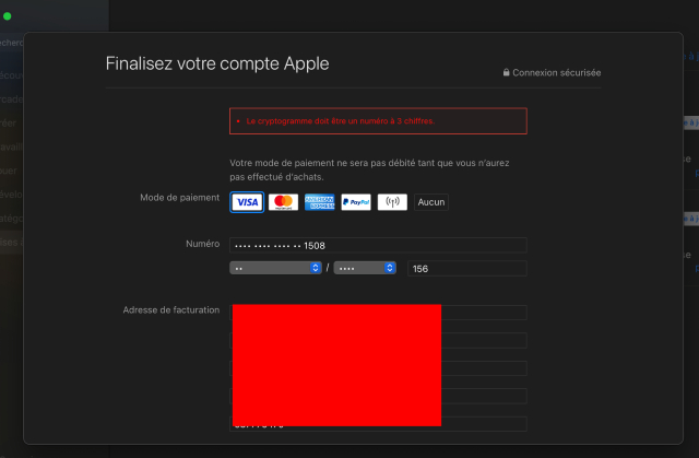 Je reste bloqué à cette étape, car bien que je saisisse un numéro de cryptogramme à 3 chiffre valide, je reçois toujours la même erreur.