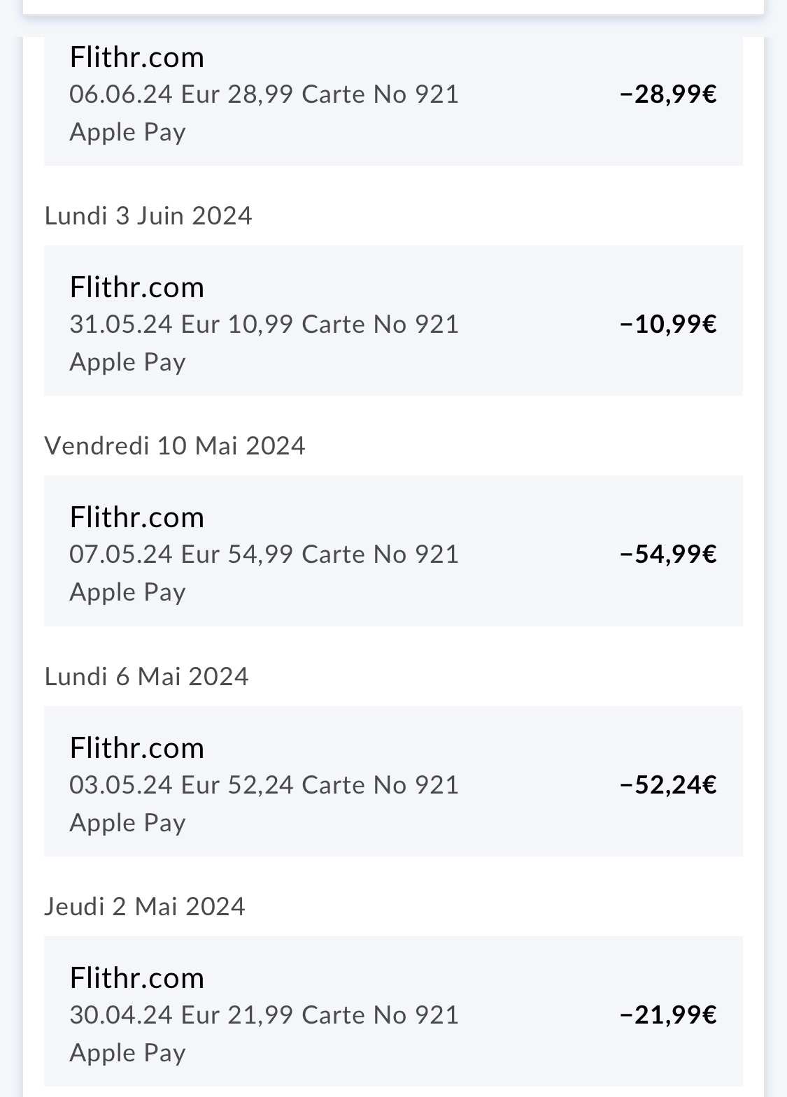 un site : FLITHR.COM m’a fait des paiements Apple Pay sur plusieurs mois dont je ne suis pas à l’origine. Quelqu’un a déjà eu ce problème svp? Toujours des sommes genre 21,99e / 28,99e / 54,99e pour environ 500e. Évidemment la banque postale dit que j’ai autorisé ces paiements… merci de votre aide :-)
