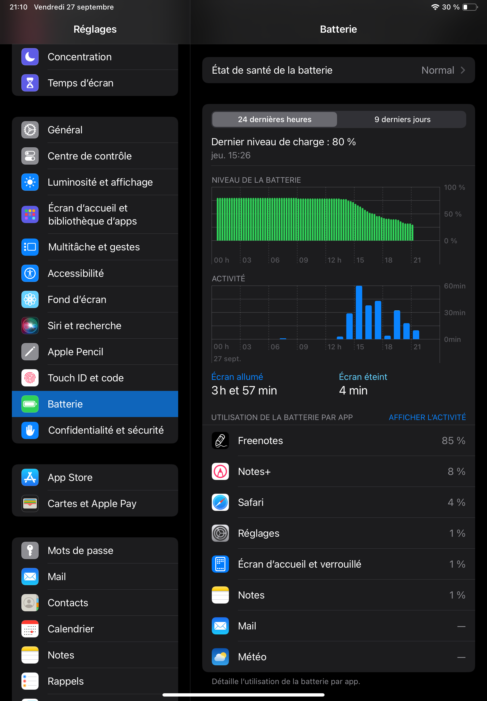 je me suis acheté un iPad Air 11 2024 récemment, et je suis assez choqué de l’autonomie de la batterie qui ne semble pas du tout respecter les 10 heures d’autonomie prescrit. Exemple concret, je prenais mes cours sur ma tablette avec l’application Notes + en m en sachant qu’il n’y avait pas de wi-fi activé, pas de Bluetooth ou AirDrop, la luminosité réglé à un peu moins de la moitié, les applications en arrière-plan sont tous désactivés ainsi que les notifications et en trois heures seulement j’ai perdu 40 % !! Est-ce normal? Je précise que je ne charge ma tablette que jusqu’à 80 %, afin de augmenter la durée de vie.
