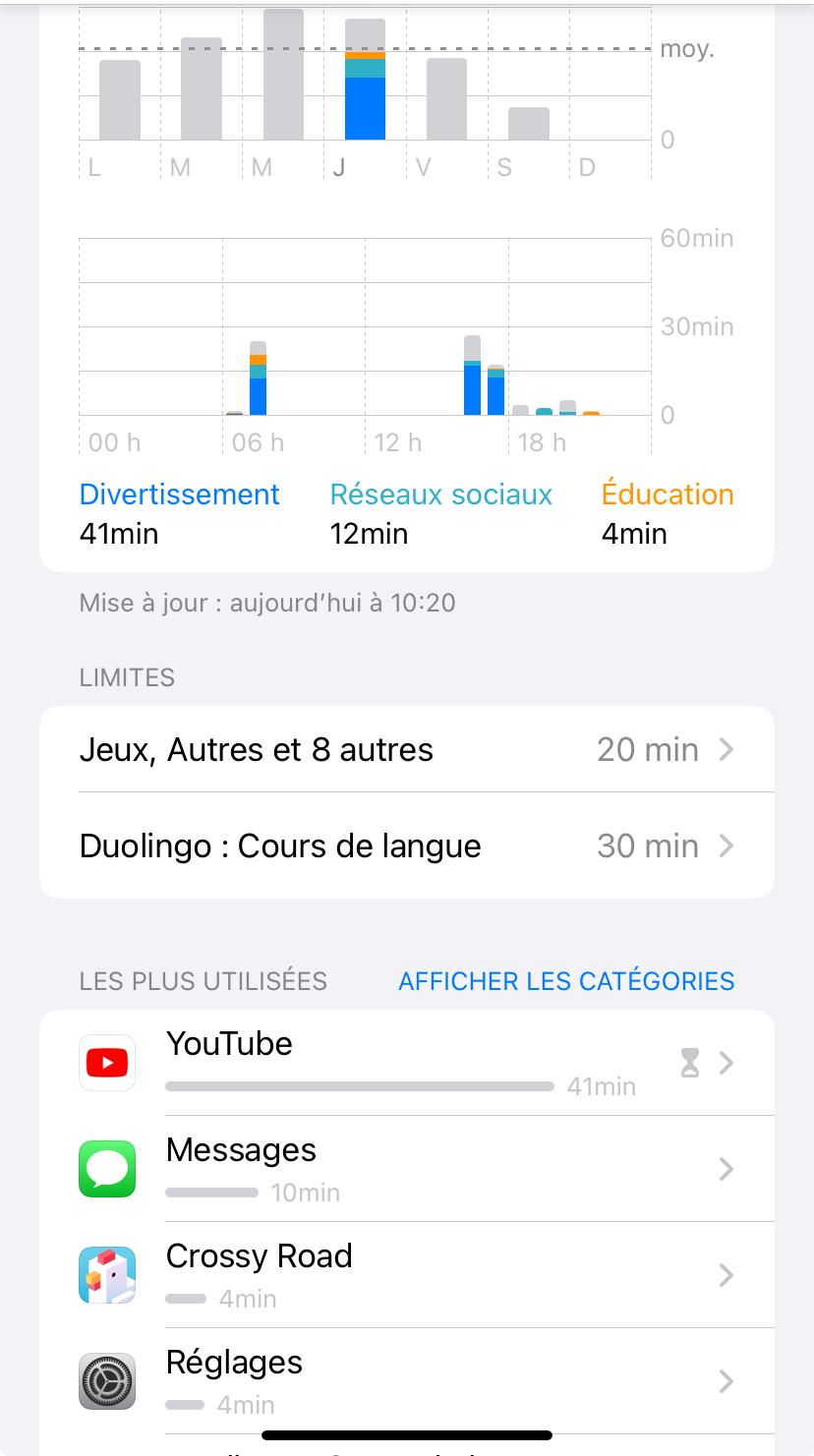 - Je viens de m’apercevoir que ma fille avait utilisé YouTube 41min jeudi alors que cela fait partie d’une catégorie limitée à 20min et que je n’ai pas autorisé d’extension (cf copie d’écran). Pour être honnête, c’est la première fois que je vois ce dépassement, mais le premier problème m’empêche de réellement contrôler régulièrement…