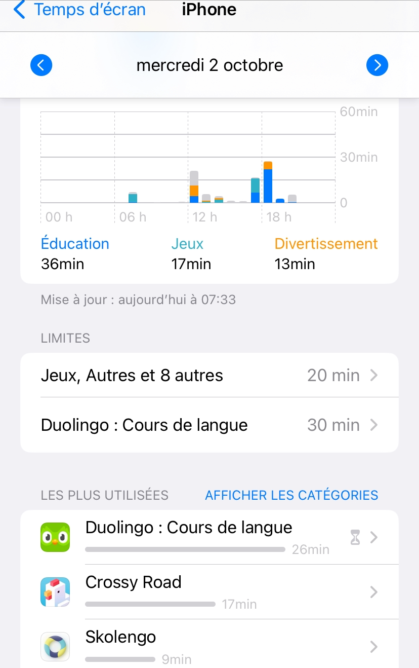 - Régulièrement, le rapport d’activité des enfants ne se met pas à jour sur mon tel, à moins que j’ouvre l’application temps d’écran et consulte le rapport depuis le tel de mes enfants.