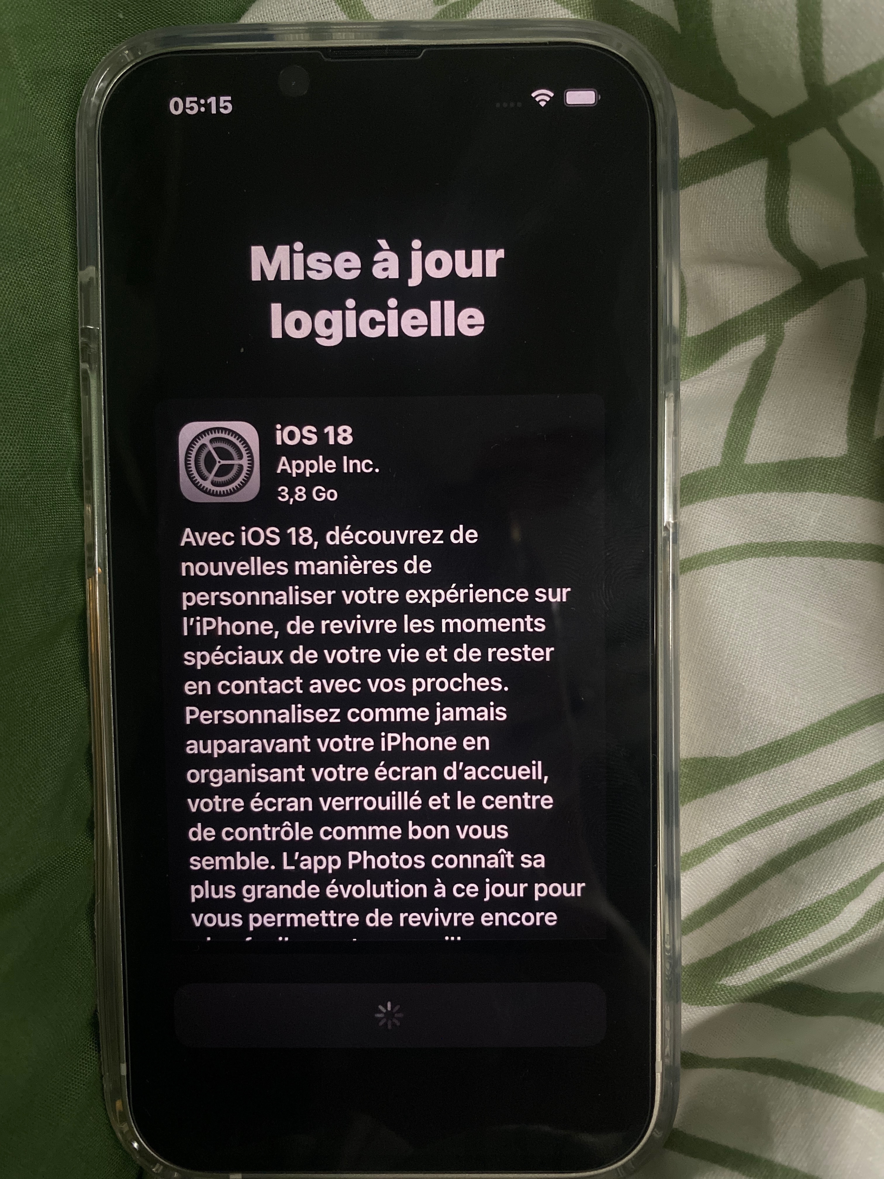 bonjour, j’ai acheté un iPhone 13 est au moment de l’activer il me demande obligatoirement de faire la maj IOS 18 avant de pouvoir transférer mes donner , seulement celle ci est en préparation depuis hier soir à 18h30 il est actuellement 5h20 du matin et mon téléphone est toujours bloqué sur la mise à jour.