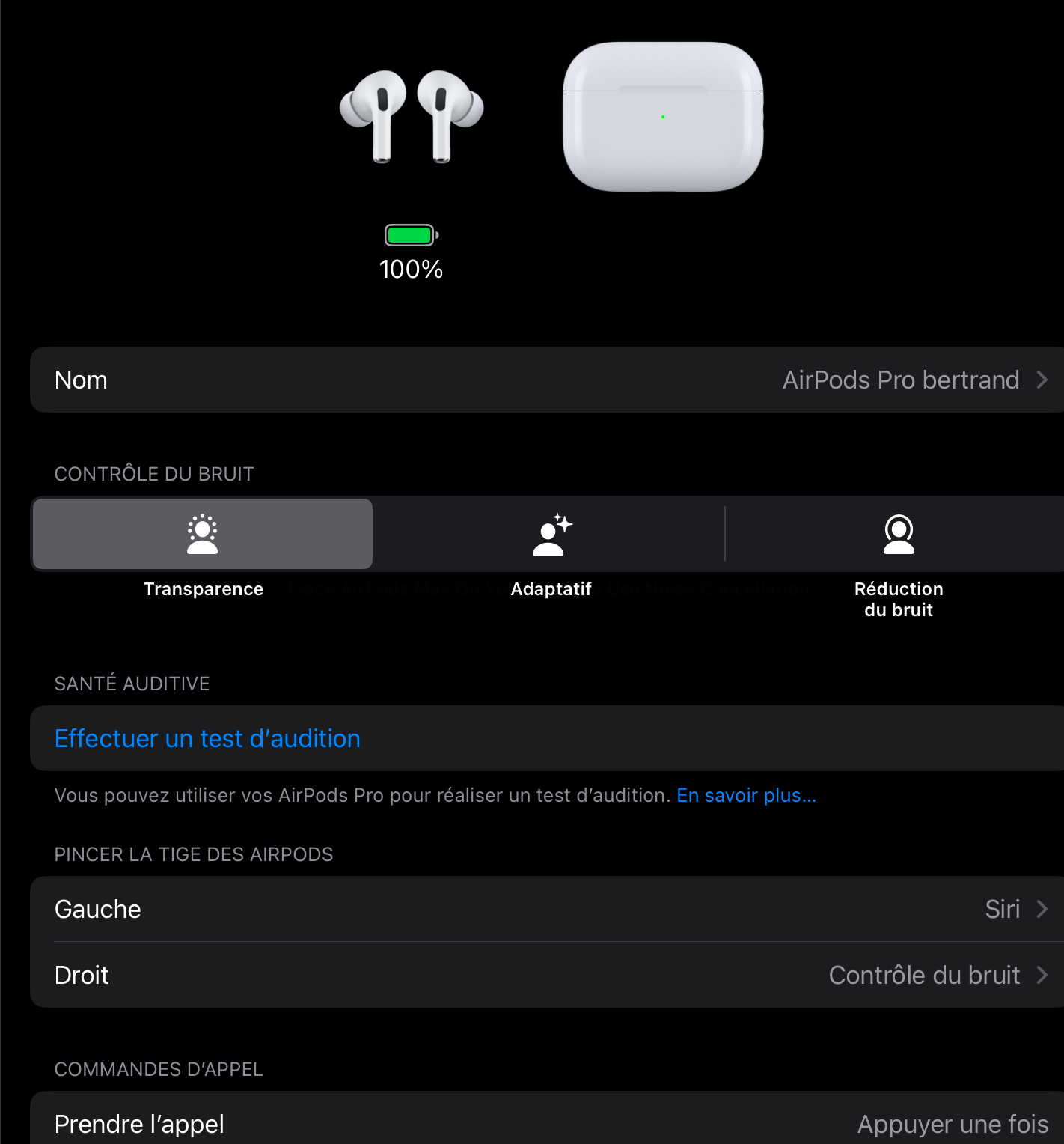 Mes airpods pro 2 sont bien mis à jour en 7B19 et mon iphone en 18.1 mais je n’ai pas l’option du test auditif en texte bleu sous le bouton permettant de basculer en mode transparence et suppression de bruit ???