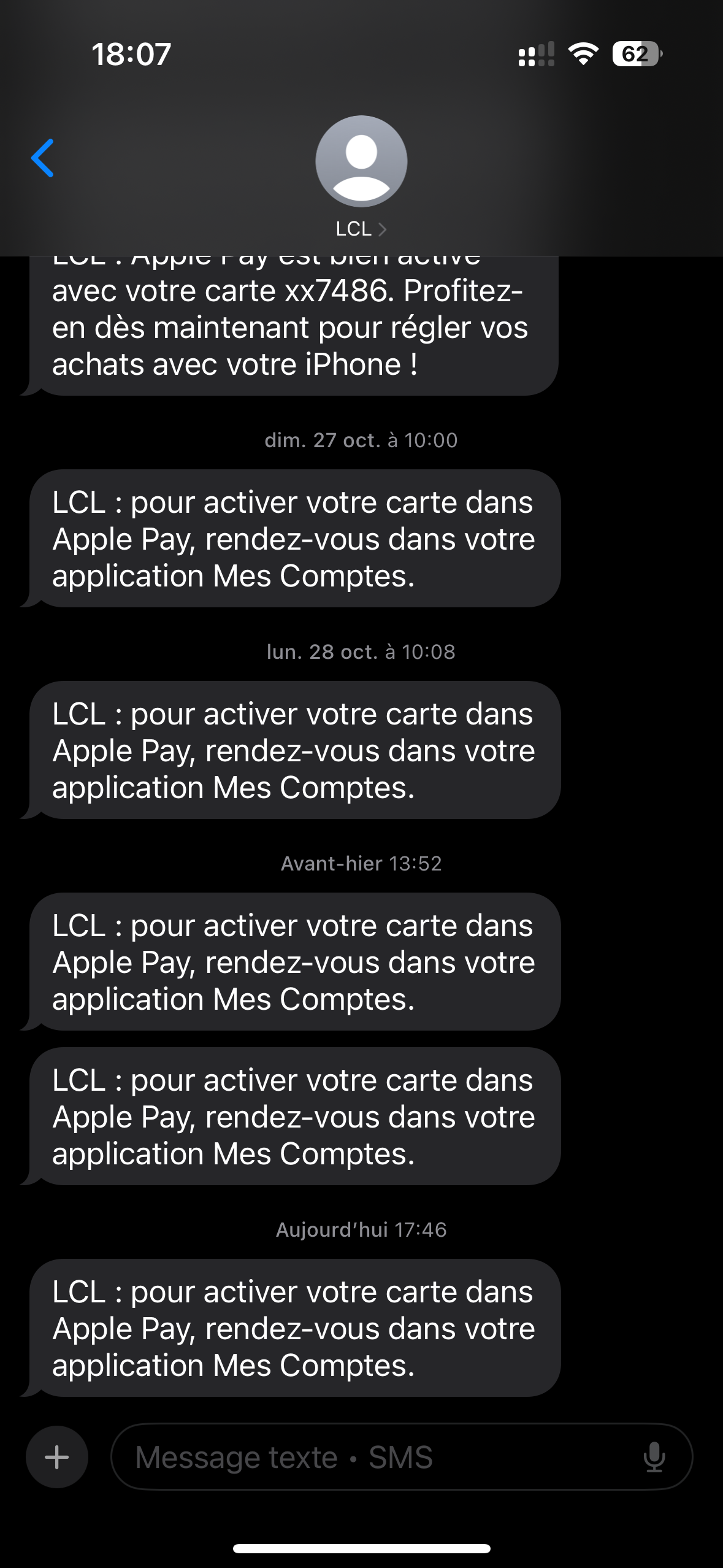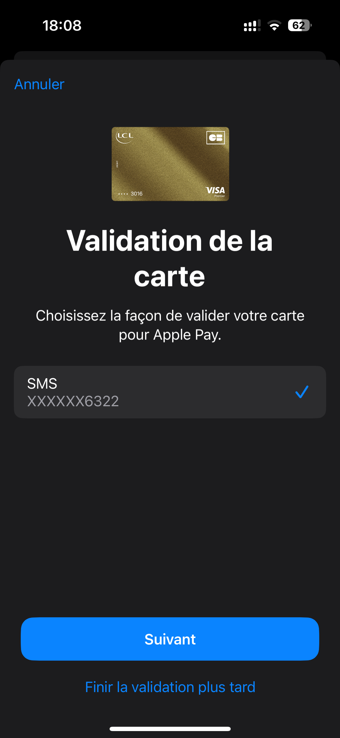 J'ai un probleme avec la validation de ma carte sur ApplePay. Je me rend sur l'application LCL Mes Comptes, dans la rubrique "cartes" puis configurer ApplePay. Je suis toutes les instructions puis on me demande de faire valider ma carte en m'envoyant un code de validation. Cependant le message que je reçois est : "LCL : pour activer votre carte dans Apple Pay, rendez-vous dans votre application Mes Comptes.". Ce n'est donc pas un code, on me demander de retourner sur l'application alors que c'est sur l'application que j'etais. J'ai aussi essayé directement d'ajouter ma carte sur l'application "Wallet" d'apple mais meme probleme. En pièces jointes vous pouvez retrouver les screenshots.