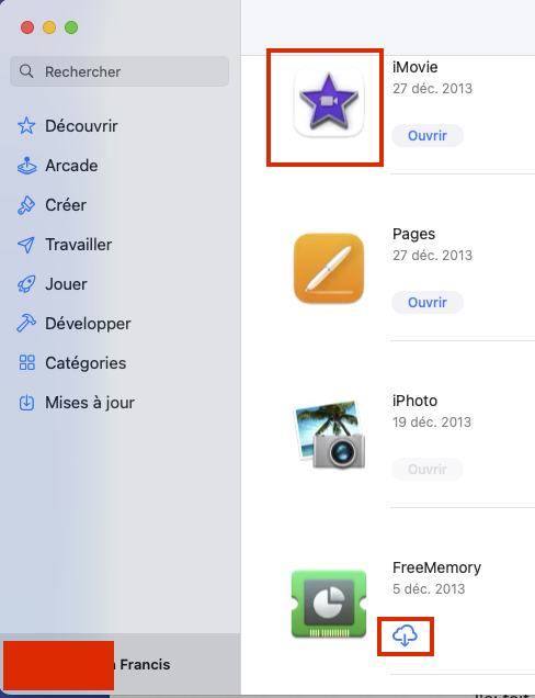 Si par contre vous voyez un bouton "Obtenir", votre Compte Apple n'a jamais téléchargé iMovie dans le passé. Vous utilisez alors probablement un Compte Apple autre que celui que vous aviez utilisé pour télécharger iMovie dans le passé.