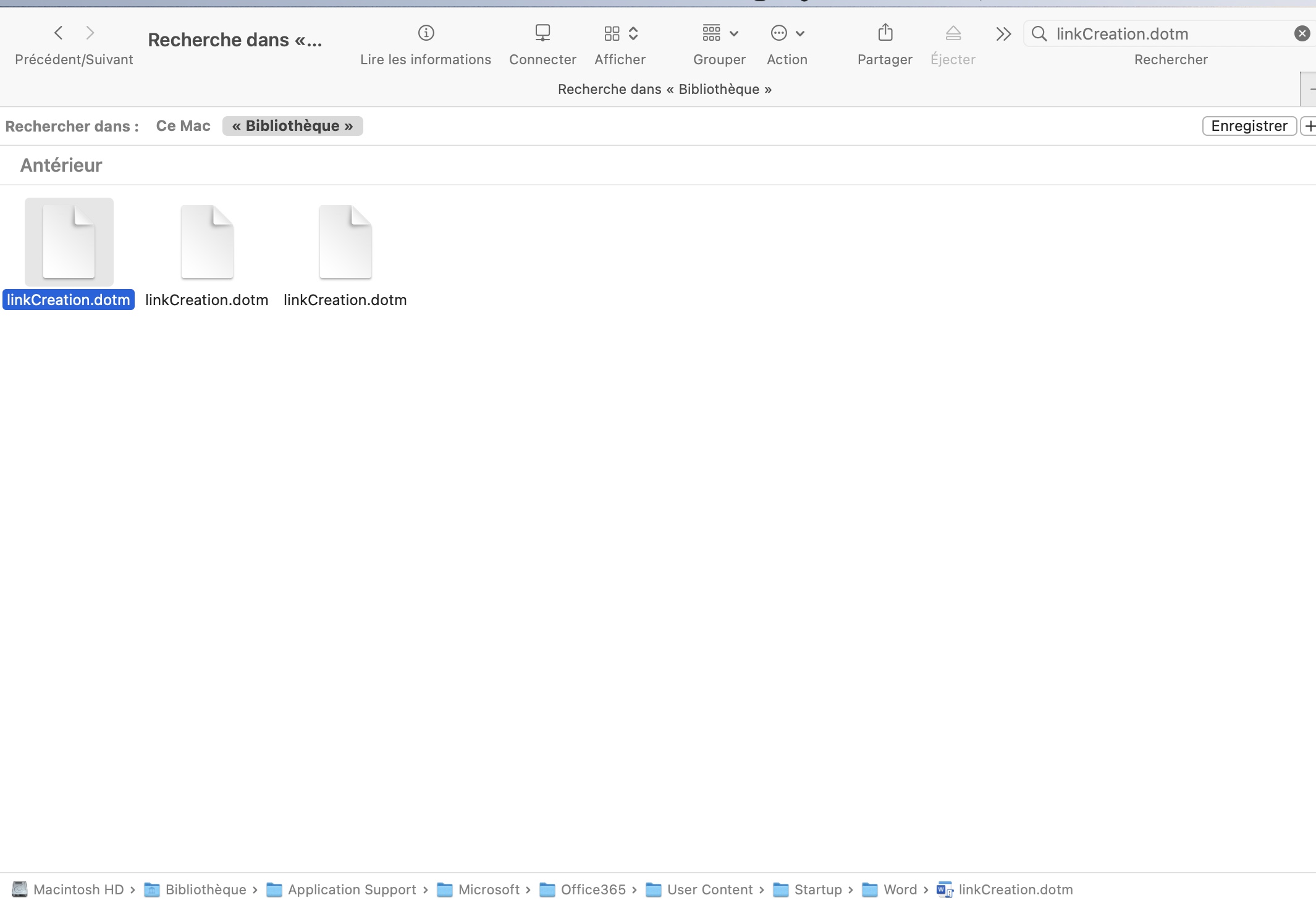 J'ai procédé comme à l'habitude: Bibliothèque- Group Containers- UBF8T346G9Office- Contenu Utilisateur - Word - et...habituellement le linkCreation.dotm est à supprimer.