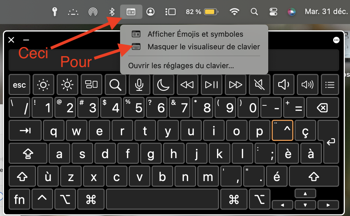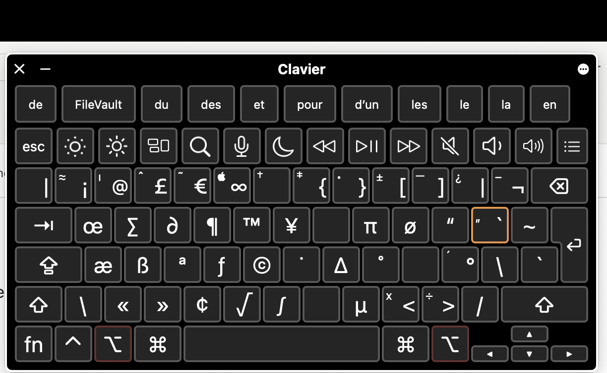 Vous pouvez des lors utilisé toute les touches de modification (shift, control, option, command, fn) avec un click sur les commande de ce clavier virtuel ou directement du clavier physique et ce clavier virtuel vas vous affichez les touches associer a ces contrôles