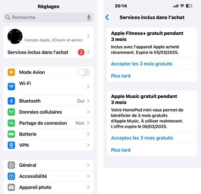 Bonjour C3Ia, lorsque l'on achète un produit Apple neuf qui permet d'obtenir une offre avec période gratuite l'offre s'affiche dans les réglages de/ des appareils.