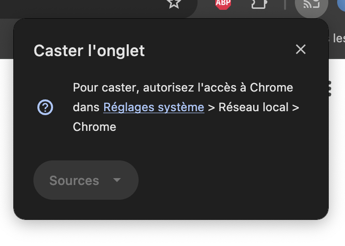 Depuis maintenant plusieurs mois, lorsque j'essaie de caster quelque chose à partir de Google Chrome, l'application me renvoie ce message: