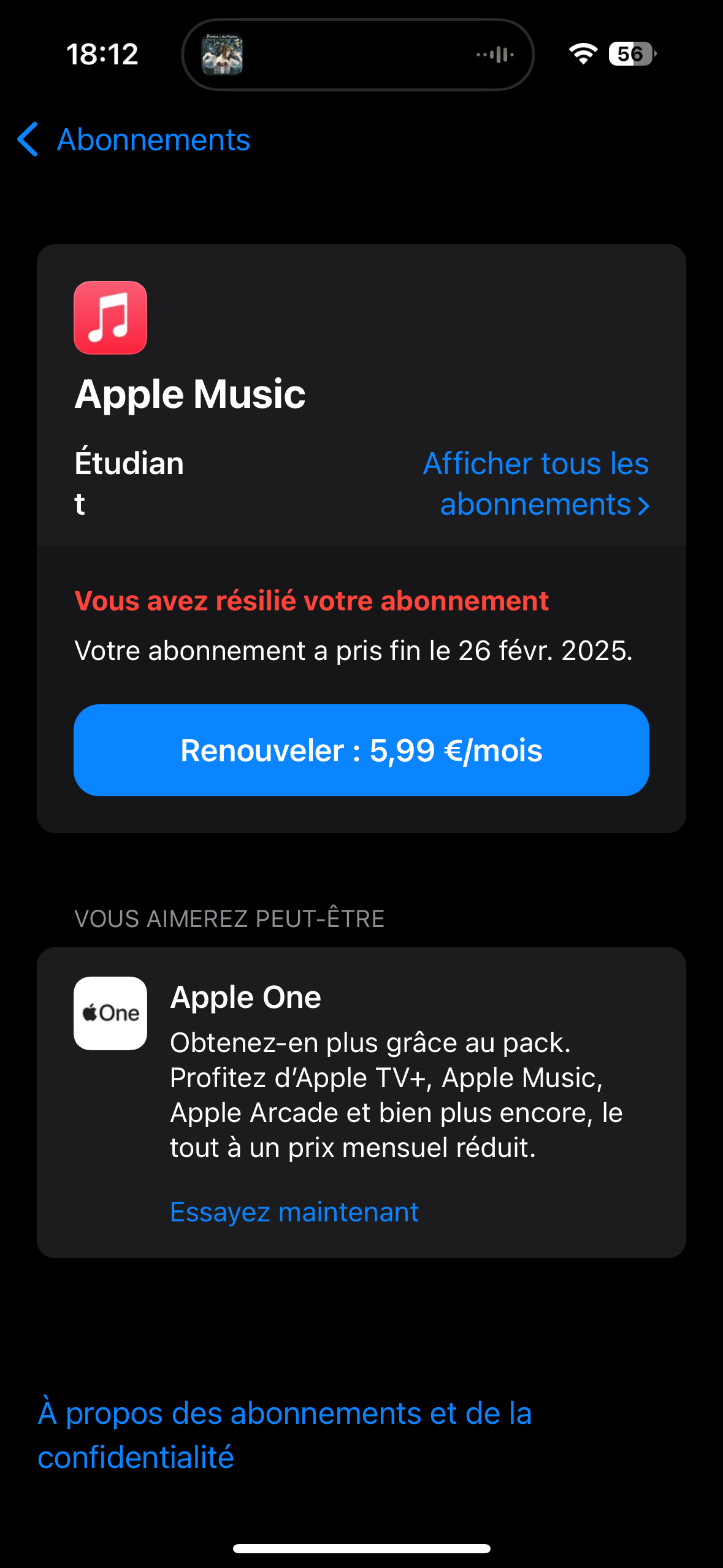 J'avais l'abonnement Apple Music Étudiant à 5,99€/mois et le mois n'était pas fini.