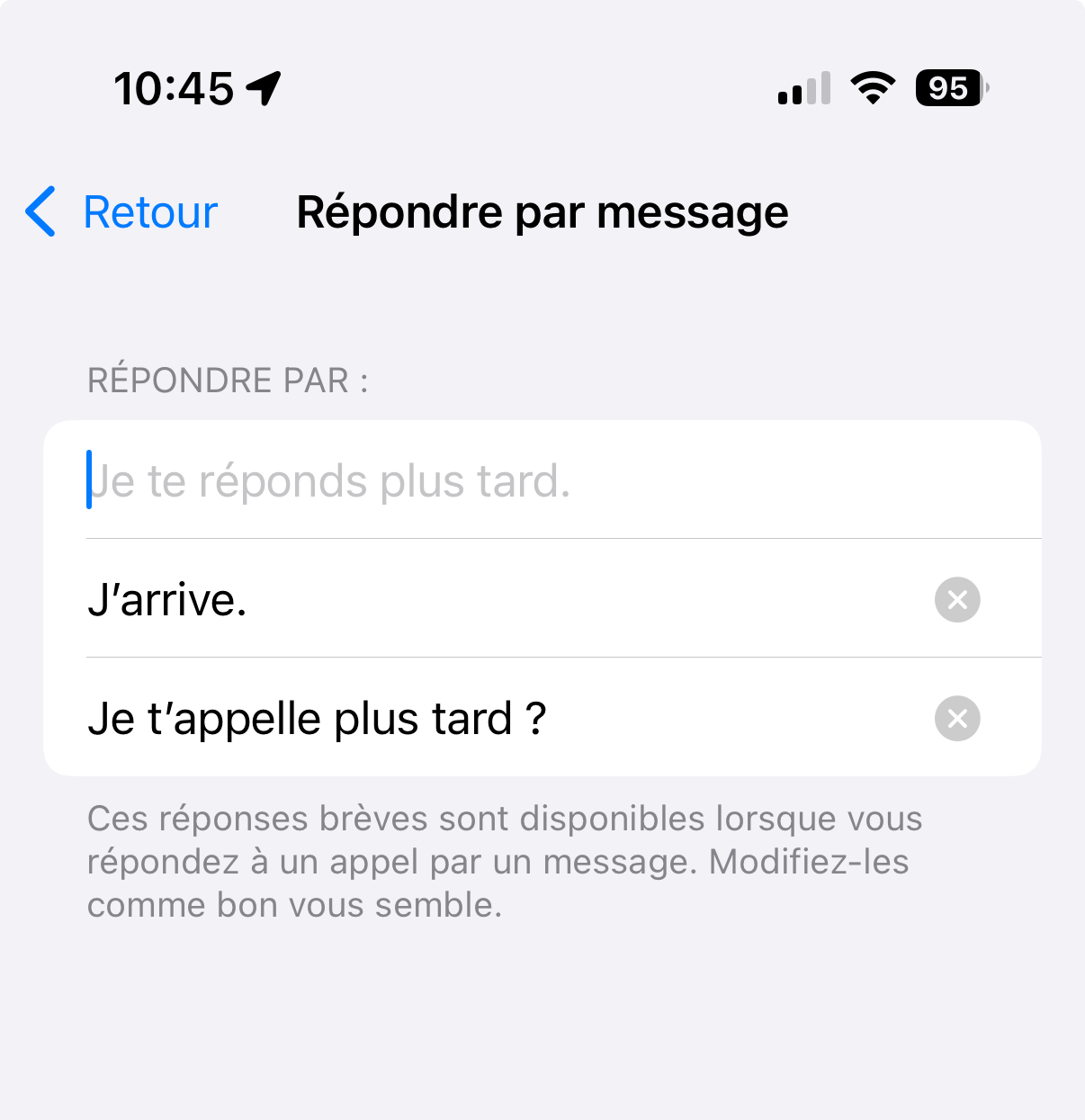 Effectivement, la possibilité d’envoyer un message pré-rempli lorsqu’on reçoit un deuxième appel a disparu pour certains utilisateurs depuis les dernières mises à jour d’iOS. 📞✉️