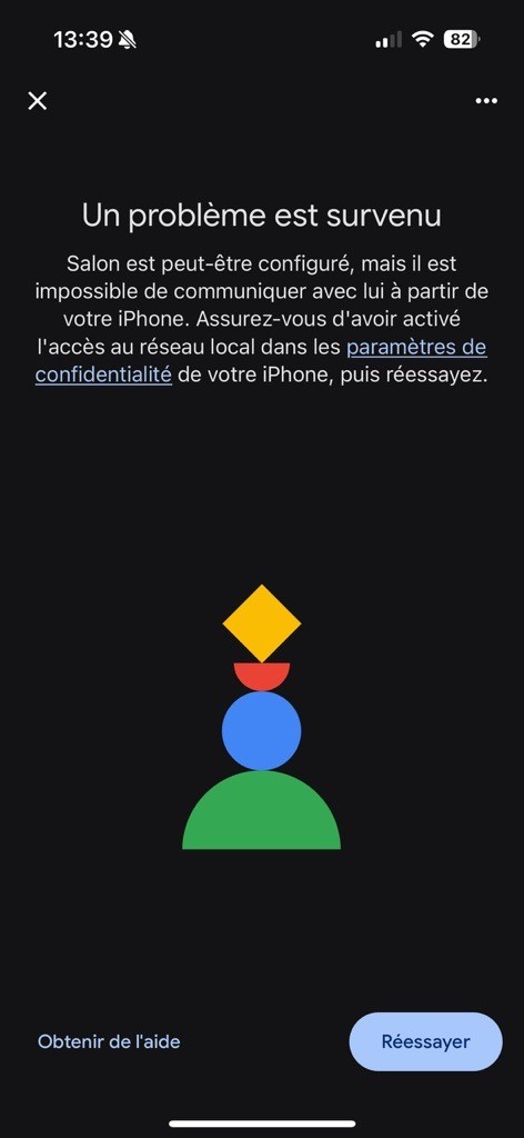 J'ai un problème avec l’application Google Home sur mon iPhone 15 PRO et ma Chromecast. Lors de la connexion il m’est indiqué: