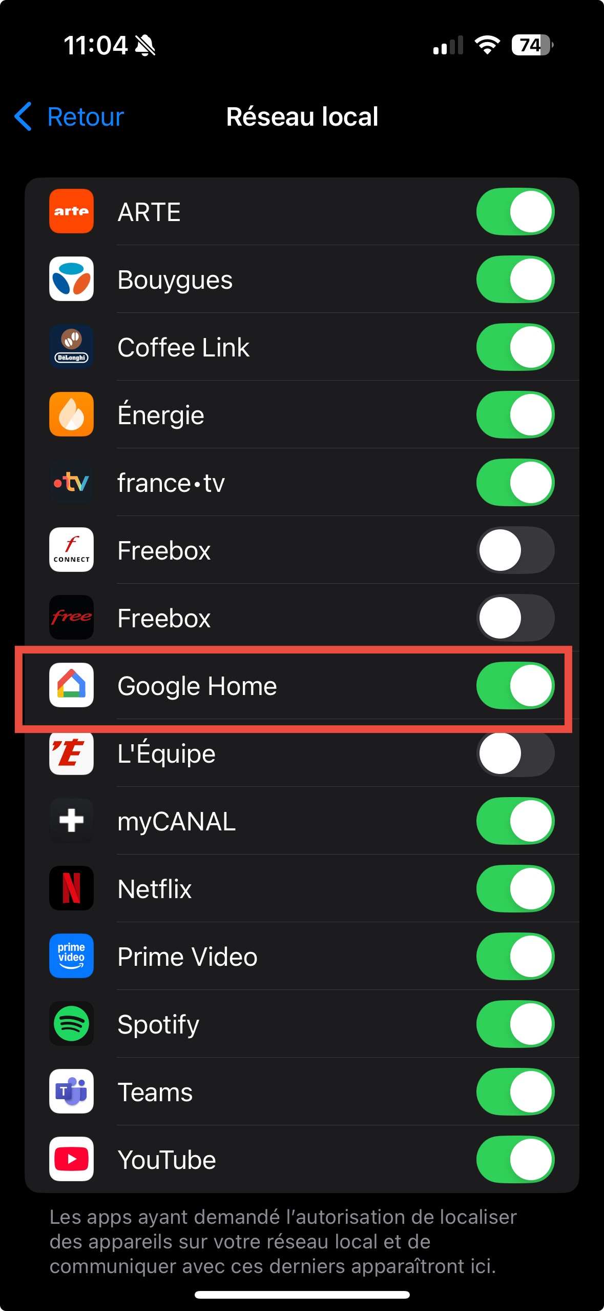 Rends-toi dans Réglages > Confidentialité et sécurité > Réseau local > et assure-toi que l'appli en question est bien activée (en vert).