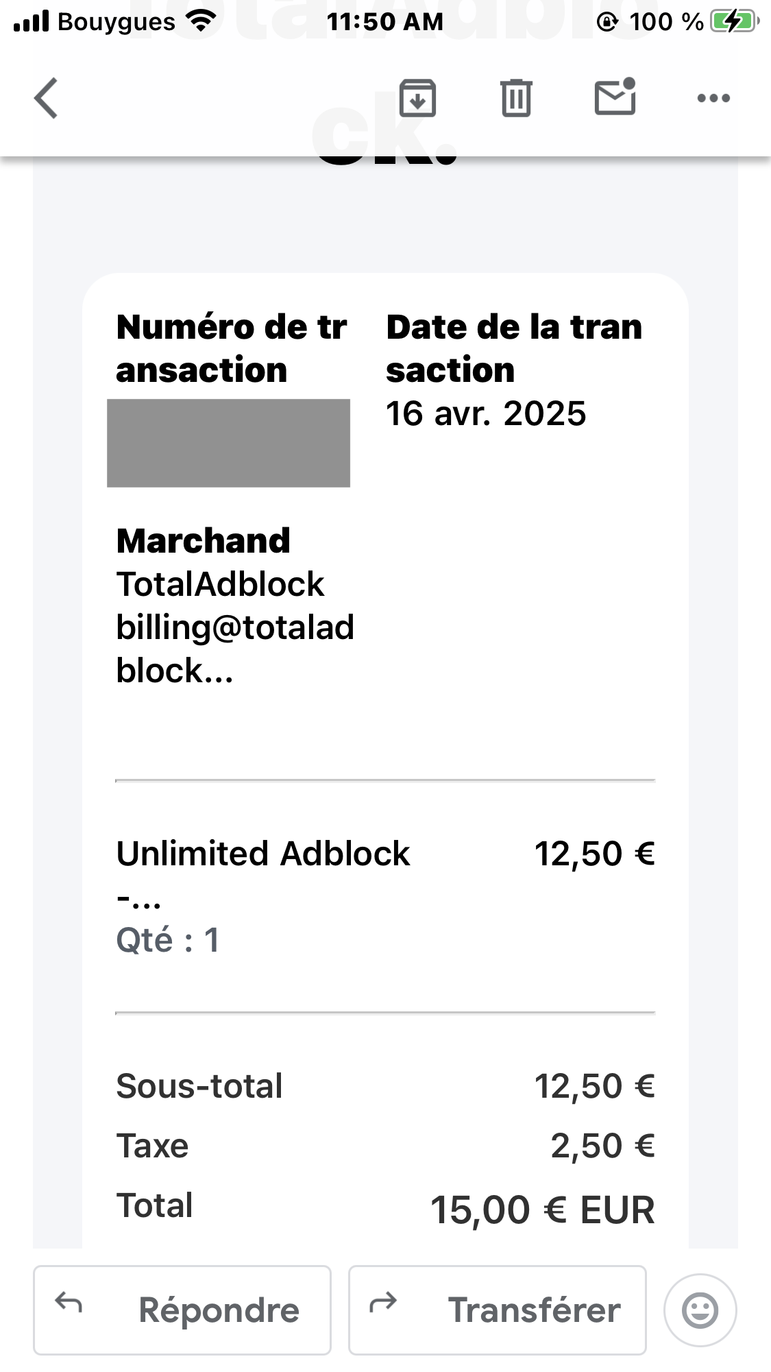 J’ai un iPhone 8 et je tente en vain de supprimer TotalAdblock depuis déjà des mois. Impossible de le faire dans mes applications; PayPal m’envoie régulièrement les factures de 15€ Merci infiniment de m’aider dans cette démarche. Cette application n’est nullement satisfaisante d’ailleurs. Bonne journée