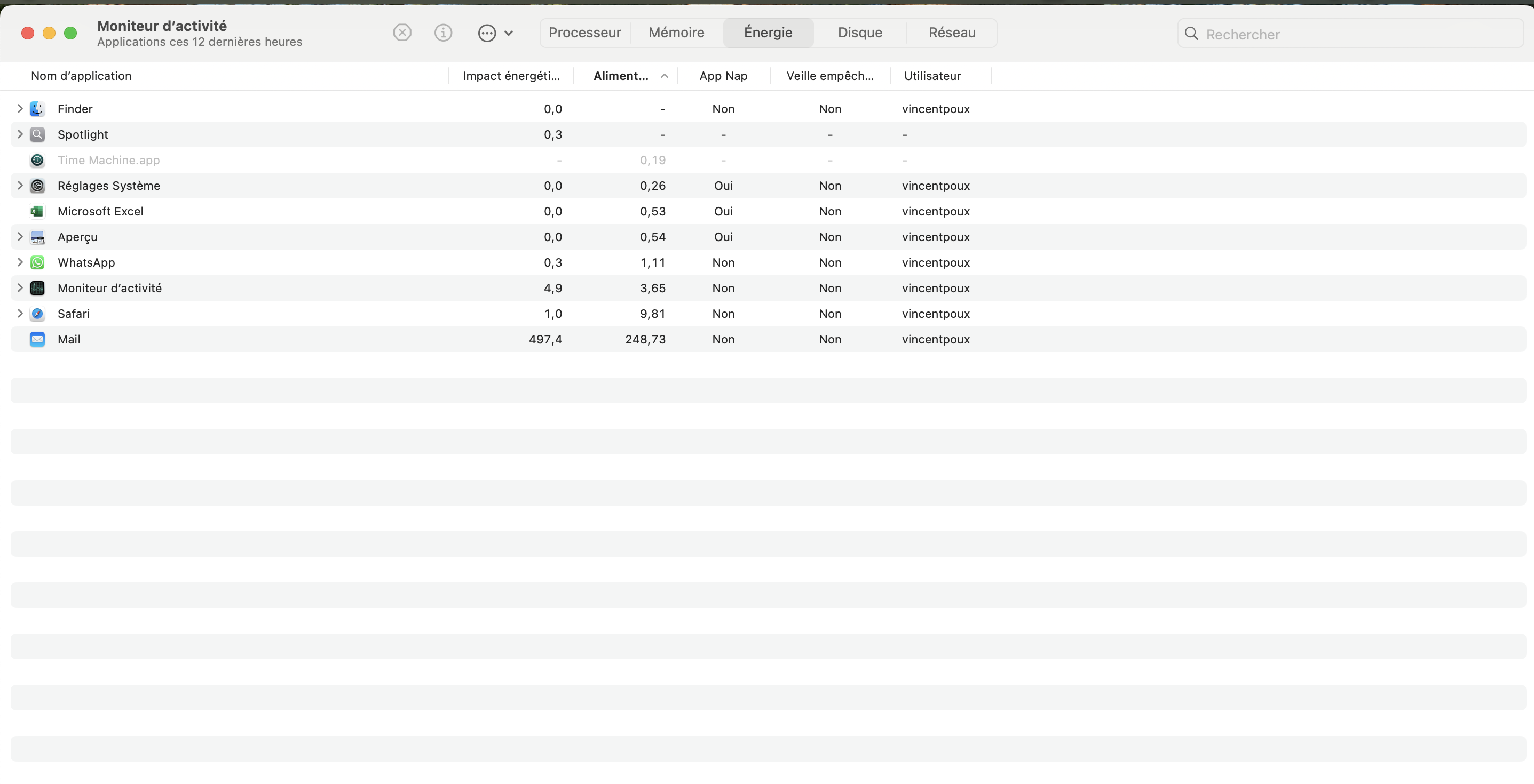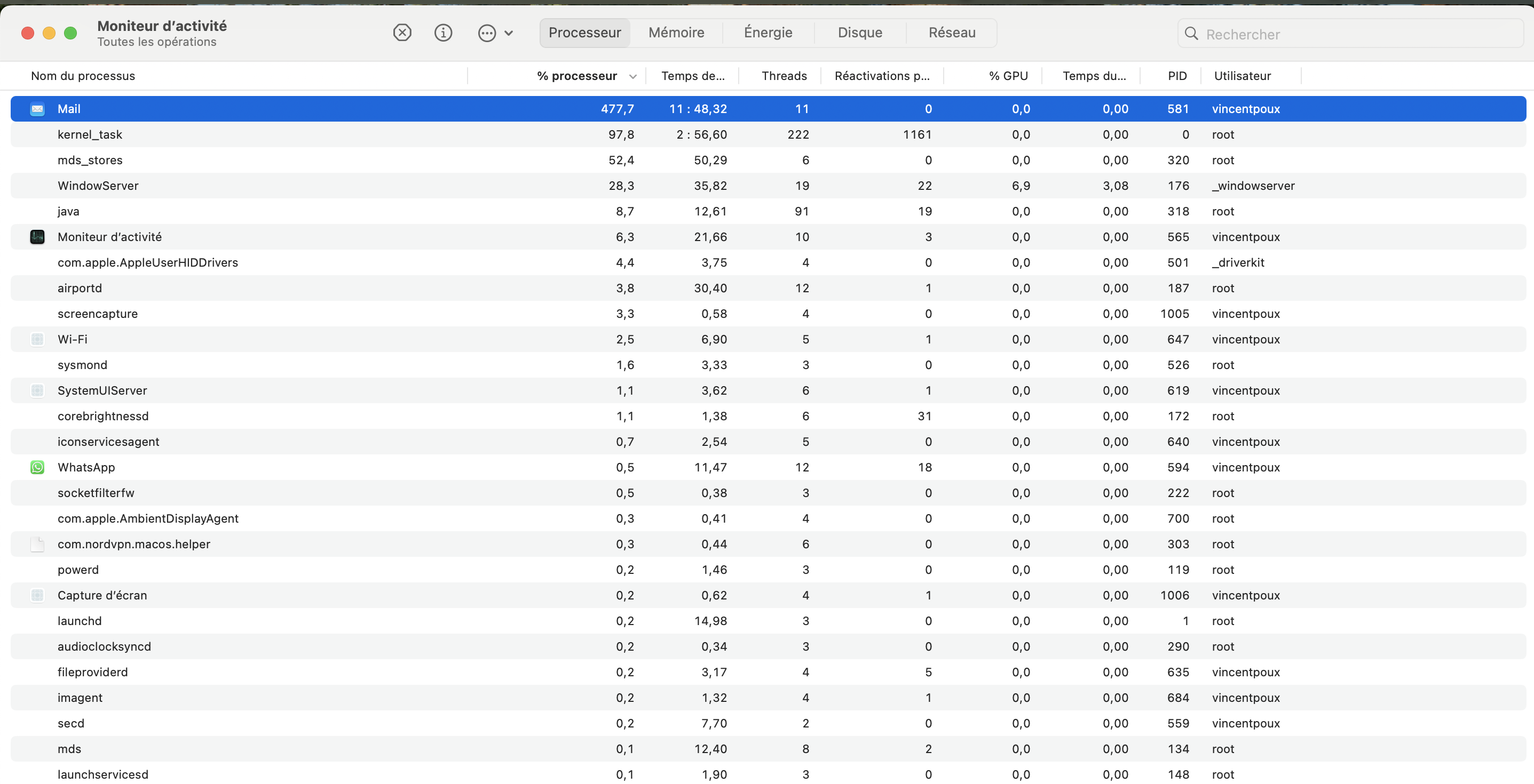 - Dans l'onglet CPU, triez les processus par **% CPU** pour identifier ceux qui consomment le plus (par exemple, `mail`, `neagent`, `icloudmailagent`, ou `mdworker` pour Spotlight).