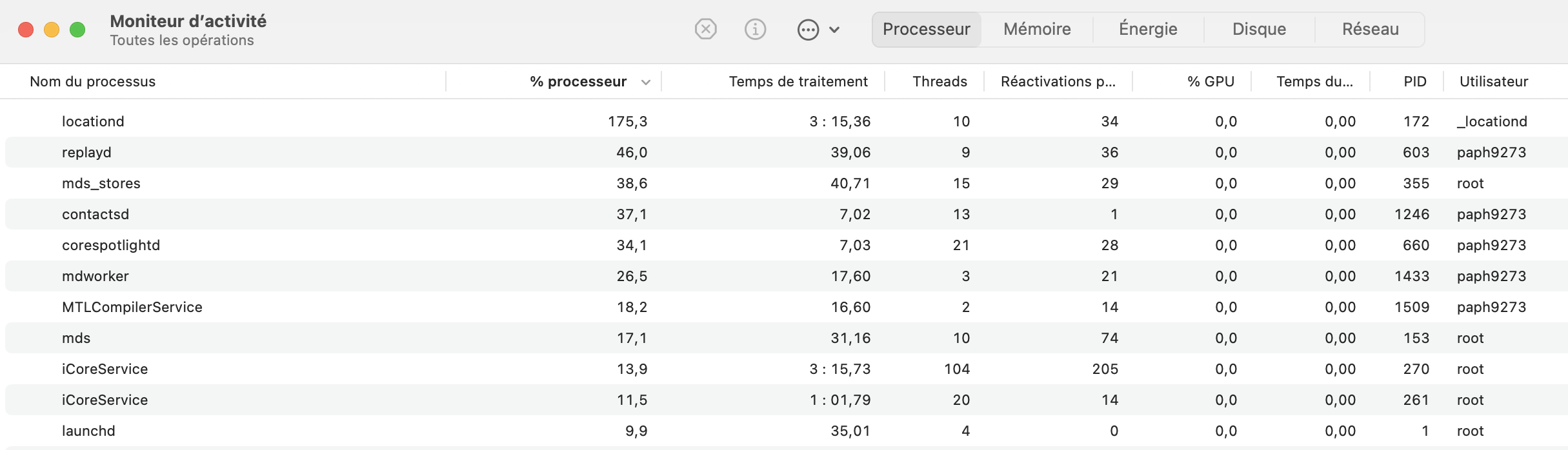 sur mon macbook pro, intel, mid 2019, en 15.5. J'ai dans l'application "moniteur d'activités", une application "_locationd" dont la charge processeur tourne toujours aux alentours de 180%. Ce qui fait que mon mac chauffe, les ventilateurs tournent à fond.