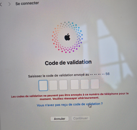 J'ai beau retenter plusieurs fois et avec toutes les tentatives possibles, rien n'y fait. Le Mac ne cesse de m'afficher "Les codes de validation ne peuvent pas être envoyés à ce numéro de téléphone pour le moment.". J'ai tenté de me connecter à mon compte Apple sur un autre ordinateur, mais on me demande les 6 codes de vérification, que je reçois pas....
