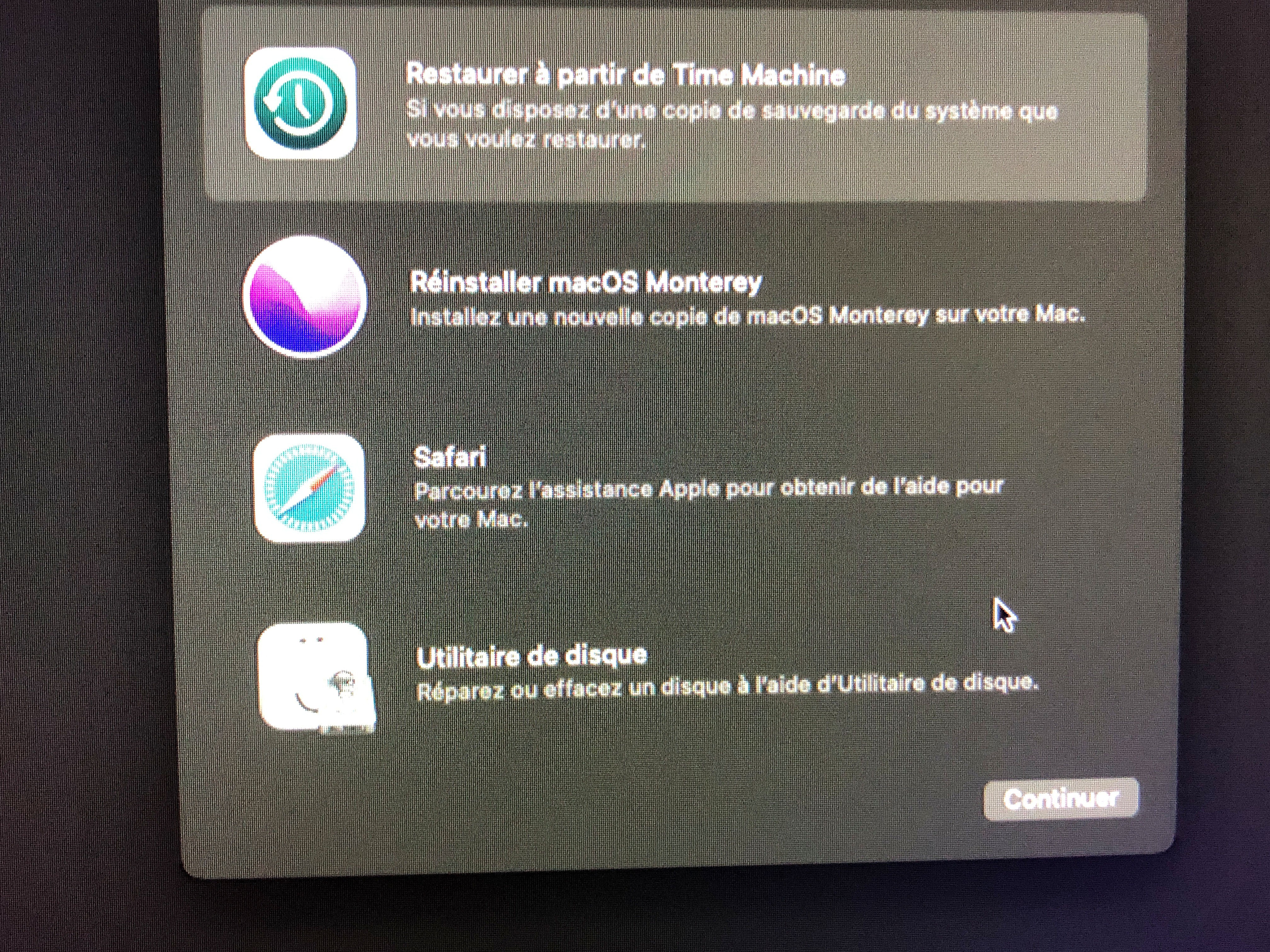 1_pour accéder aux Utilitaires macOS je dois redémarrer puis appuyer sur Alt mais aussi sur la "pomme" et sur R , c'est normal ? ( parce que si j'appuie que sur Alt je tombe sur mon disque !! mais ils me demandent de connecter sur mon réseau wifi (ça reconnait pas le mot de passe) ?