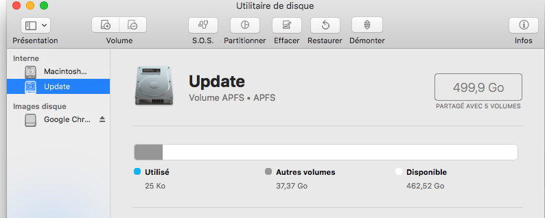Je vois que le format du disque interne est déjà sous APFS, le volume Update est donc bien un volume et non une partition comme on l'entend habituellement pour les anciennes versions de macOS avant APFS.