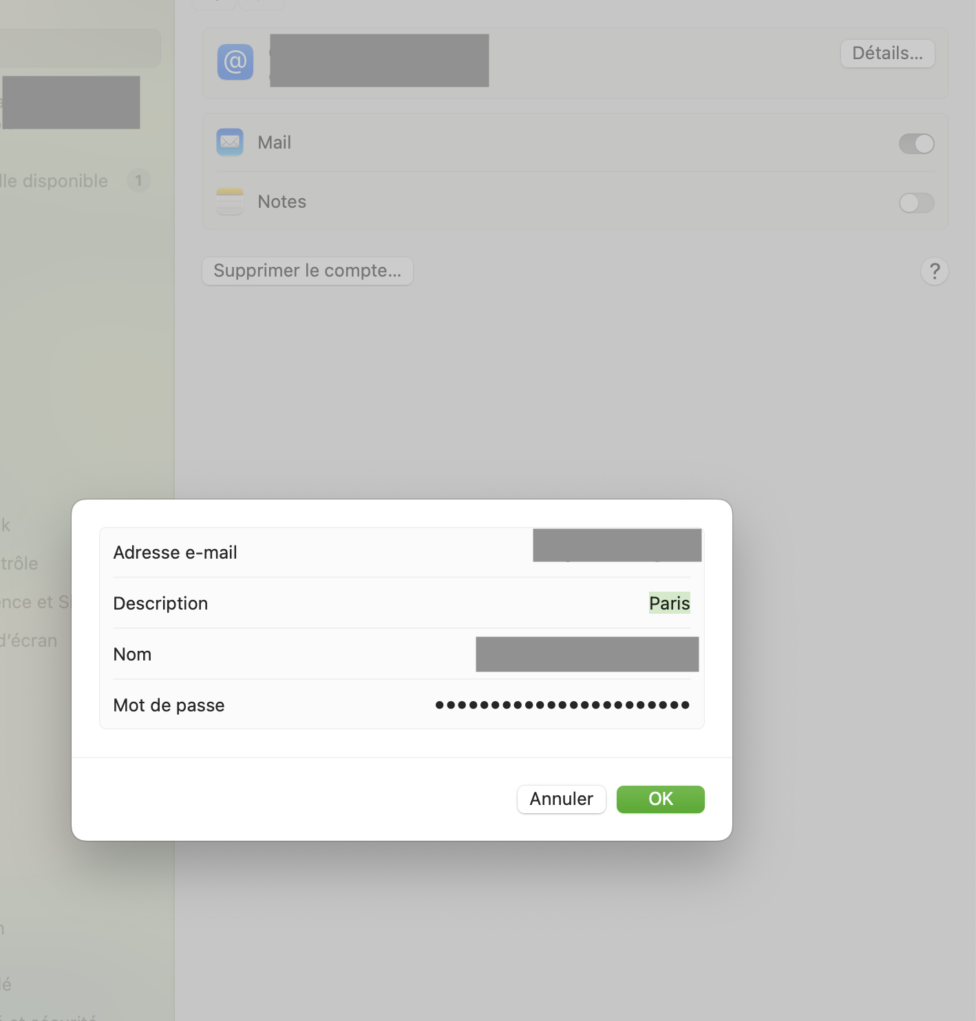 Mon iMac et mon MacBook Pro sont synchroniser sauf Mail. Quand je suis sur iMac j'obtiens cette fenêtre or je ne veux pas créer un compte @icloud.com. Quand je suis sur MacBook Pro, on me demande ajouter un compte Mail avec mon adresse et mon mot de passe. Je n'ai pas mon mot de passe sauf en•••. Comment/où le retrouver ?
