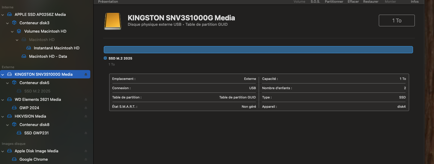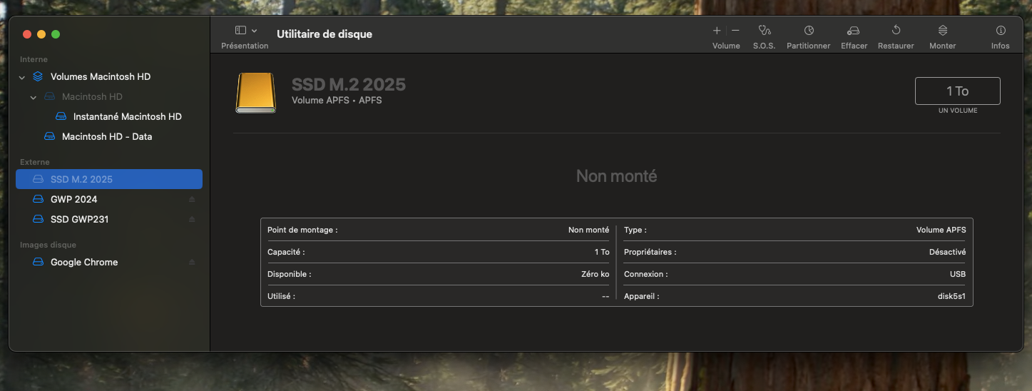 Veuillez noter qu’il m’est arrivé de détériorer (briquer) un disque SSD Thunderbolt (avec un NVMe) en tentant d’y installer une version de démarrage de macOS (Sequoia bêta) afin de la faire exécuter sur mon MacBook Pro.