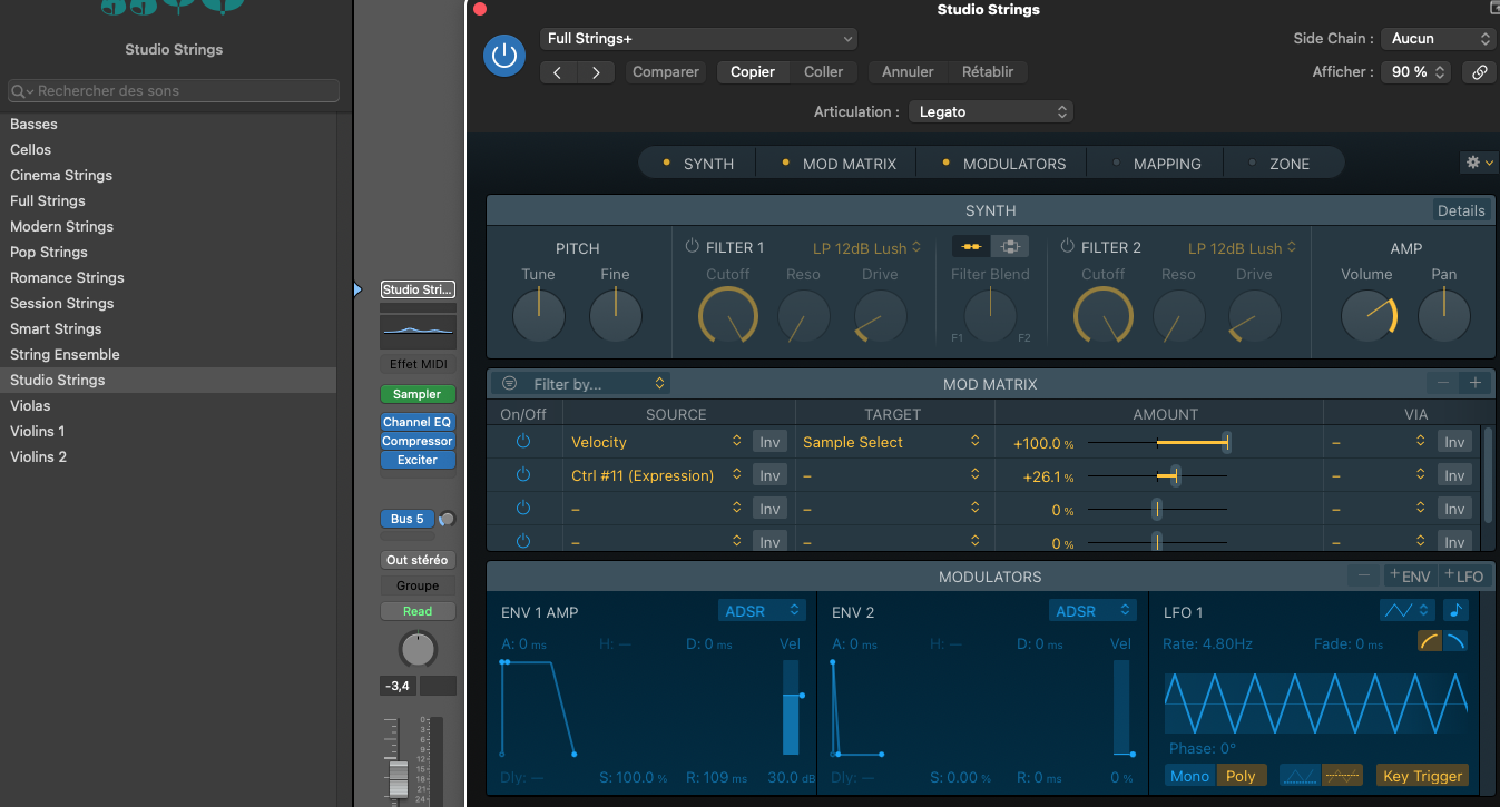 Lorsque que je lance l'instrument "Studio Strings" dans la bibliothèque, c'est le sampler qui s'ouvre (en vert dans la piste), et non l'instrument nommé "Studio Strings".
