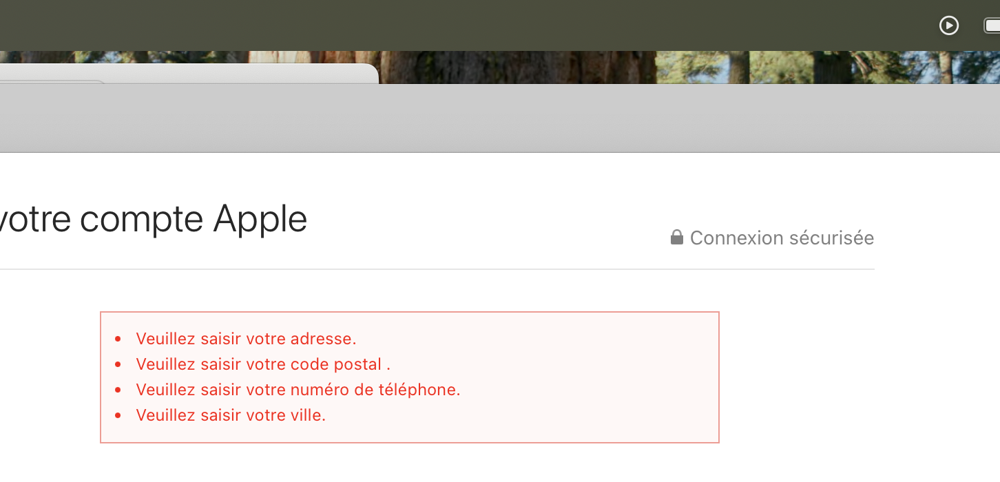 J'essaie de finaliser mon compte Apple Store en donnant des informations comme ma rue, ma ville, mon code postale et mon numéro de téléphone mais quand je clique sur continuer (une fois avoir donnée les informations correctes), ça me dit "veuillez saisir votre code postal".