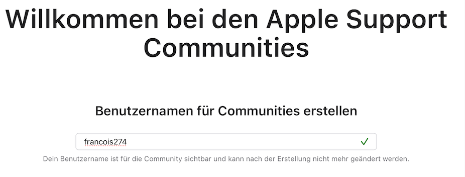 Par ailleurs je me suis connecté sur le site allemand communities.apple.com/de/welcome et ça marche, ils m'ont même attribué immédiatement un pseudo.