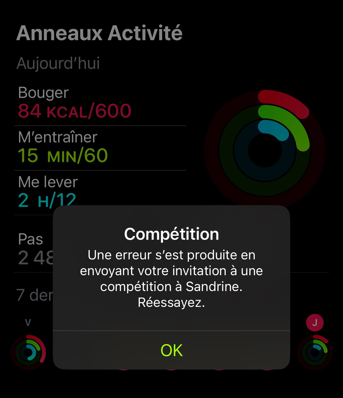 depuis plusieurs mois je ne peux plus « affronter » un ami dans mon application Forme. L’ami est invité et a répondu à l’invitation mais nous ne pouvons plus être en compétition. Chacun a découpler sa montre du iPhone. Rien ne change. Les mises à jours successives ne règles rien. Un message d’erreur intervient quelque soit le sens de l’invitation.