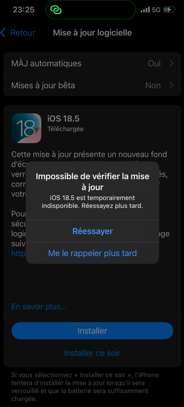 Le message affiché est : “iOS 18.5 est temporairement indisponible. Réessayez plus tard.”