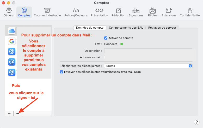 Par contre, vous pouvez supprimer le compte concerné, en l'occurence le compte Gmail, de Mail, et conserver ce compte dans Spark. Cela n'affectera pas le contenu du compte. Rien de plus facile. Vous ouvrez les préférences du compte, sélectionnez le compte et cliquez sur le signe moins , exemple :