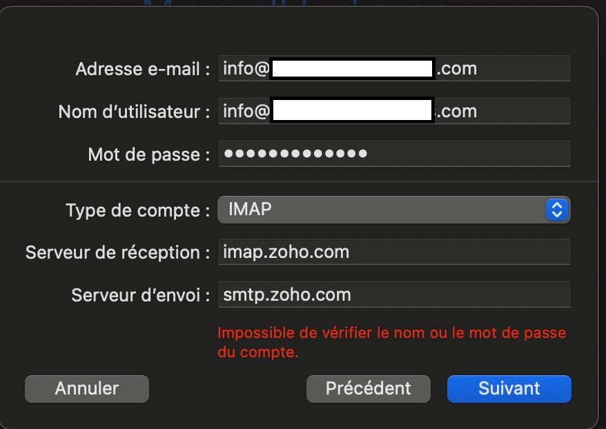 Je rencontre actuellement un problème de synchronisation avec mon adresse e-mail professionnelle (info@***********.com) sur l’application Mail d’Apple.
